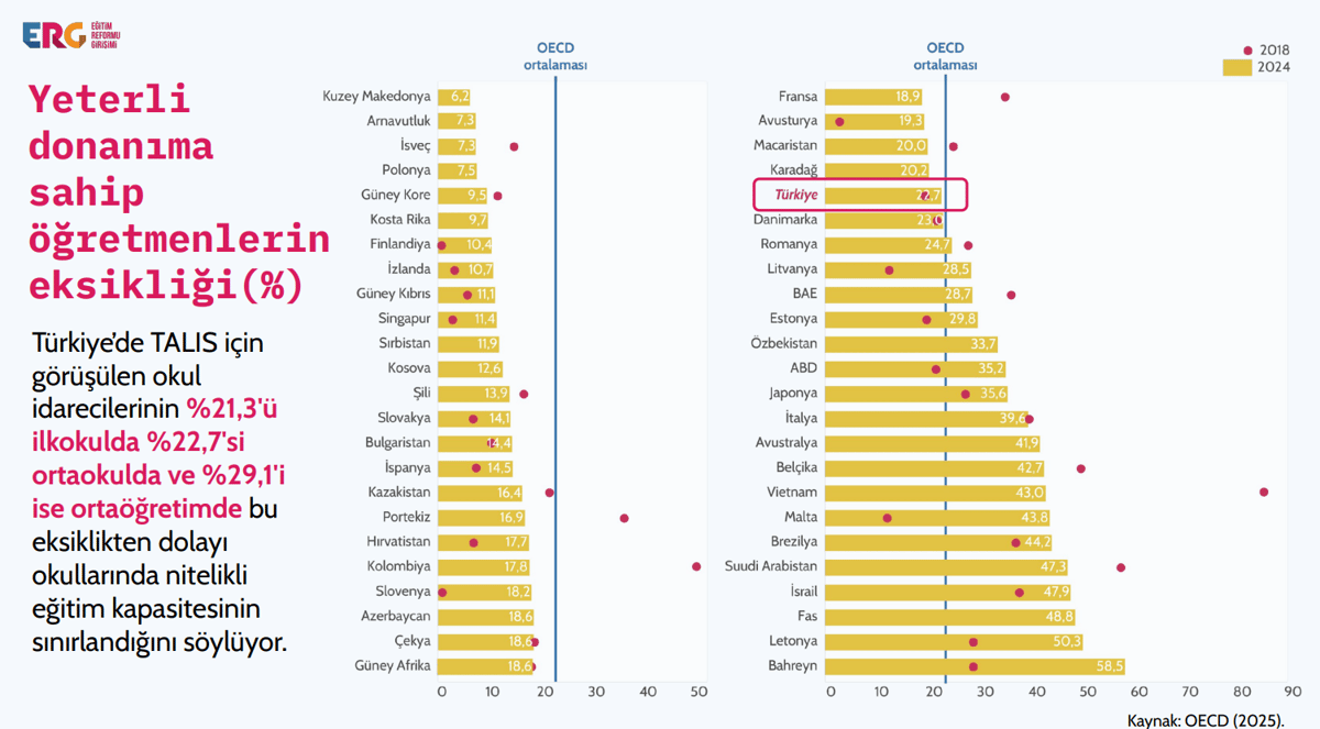 Rapor, öğretmenlerin mesleğe olan ilgisinin yüksek olduğunu (ilk kariyer tercihi öğretmenlik olanların oranı yüzde 73,6) belirtse de, bazı zorluklara dikkat çekiyor. Rapora göre, okullarda yeterli donanıma sahip öğretmen eksikliği Türkiye'de ilkokulda yüzde 21,34, ortaokulda yüzde 22,7 ve lisede yüzde 29,1.