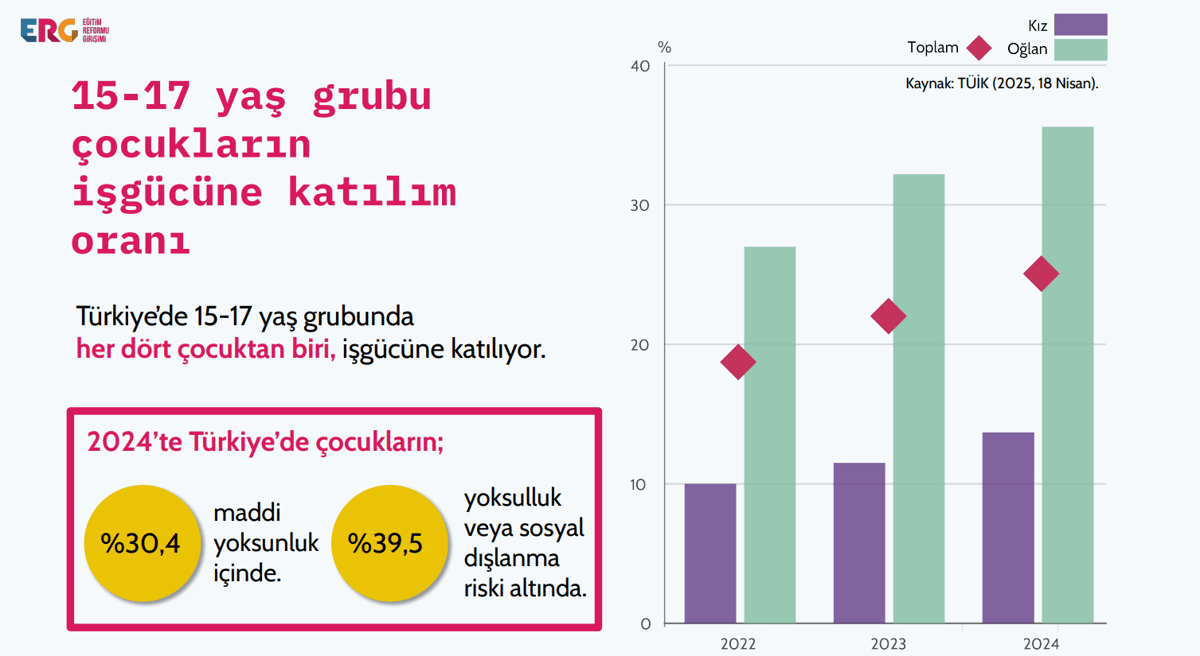 - Türkiye'de çocukların yaklaşık yüzde 39,5'i 'yoksulluk veya sosyal dışlanma riski' altında yaşarken, 15-17 yaş grubundaki her dört çocuktan biri iş gücüne katılıyor.