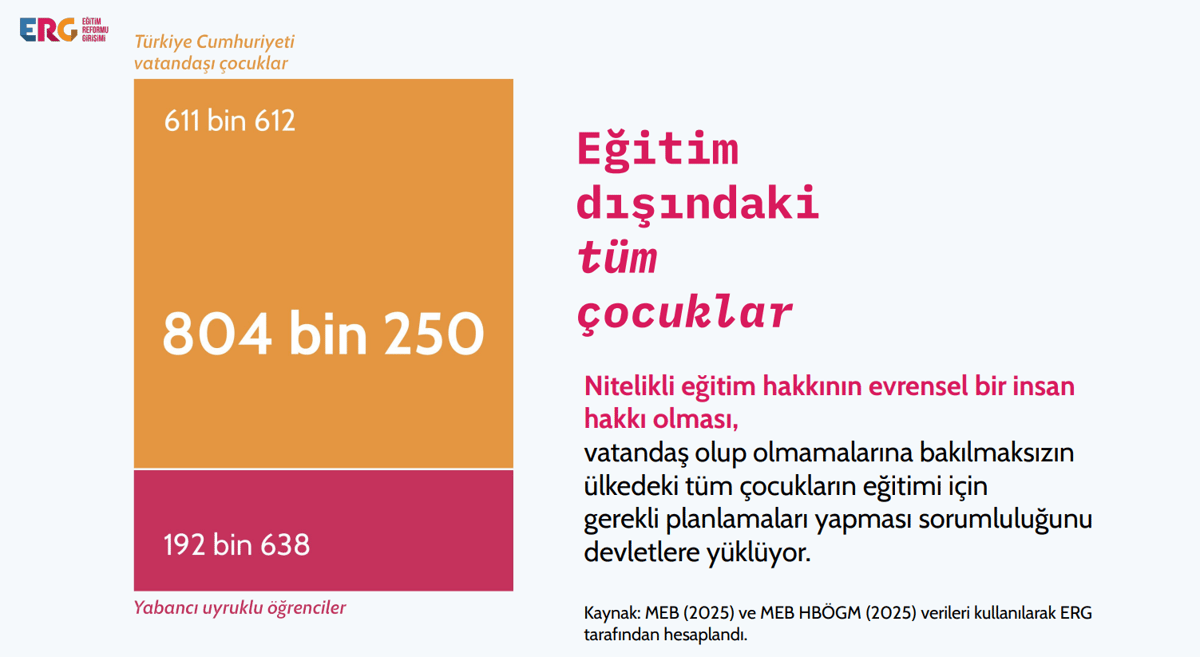 - Rapora göre, zorunlu eğitim çağında olmasına rağmen yaklaşık 804 bin 250 çocuk örgün eğitim dışında.