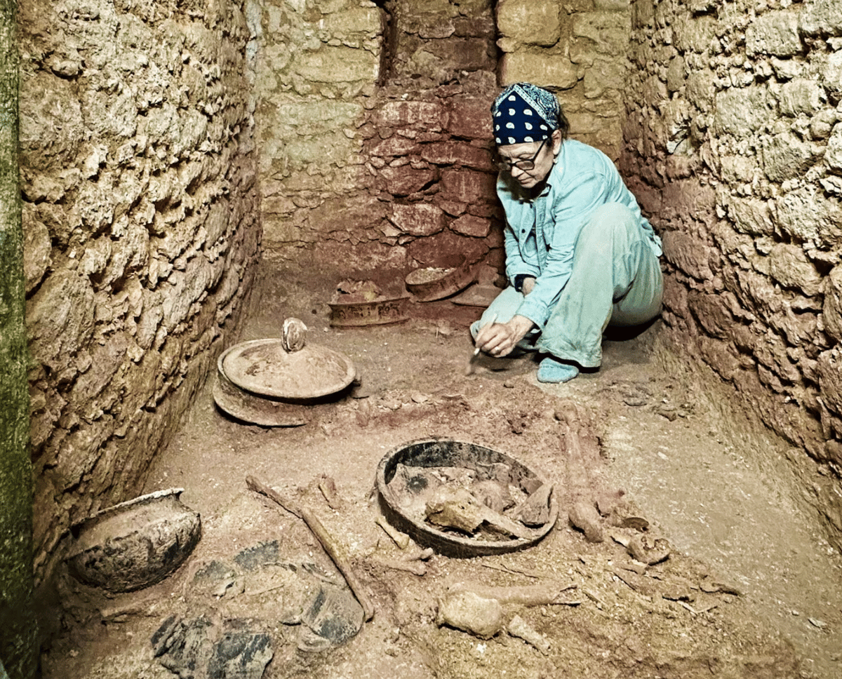 - Mezarın içinde parçalanmış bir yeşim ölüm maskesi, mücevherler ve hayvan figürleriyle süslenmiş seramik kaplar gibi değerli eşyalar bulundu.