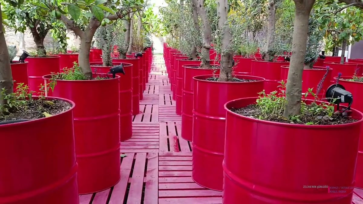 "Kırmızı Rotavesait" (2025), farklı emek, hareket ve aidiyet biçimleri üzerine düşündüren mekânsal bir müdahale olarak tasarlandı. Khalil Rabah’ın kariyeri boyunca odaklandığı toprak mücadelesi, tehcir ve egemen tarih anlatılarının sorgulanmasının bir yansıması olan yerleştirme, bulunduğu mekânın geçmişine de gönderme yapıyor. Eser, ziyaretçileri variller içine dikilmiş ağaçlar arasında dolaşmaya davet ediyor.