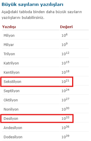 Dünya Bankası verilerine göre dünya ekonomisinin 2023'teki büyüklüğü yaklaşık 105 trilyon dolar iken 20 desilyon dolar bu rakamın kentilyonlarca katı anlamına geliyor.