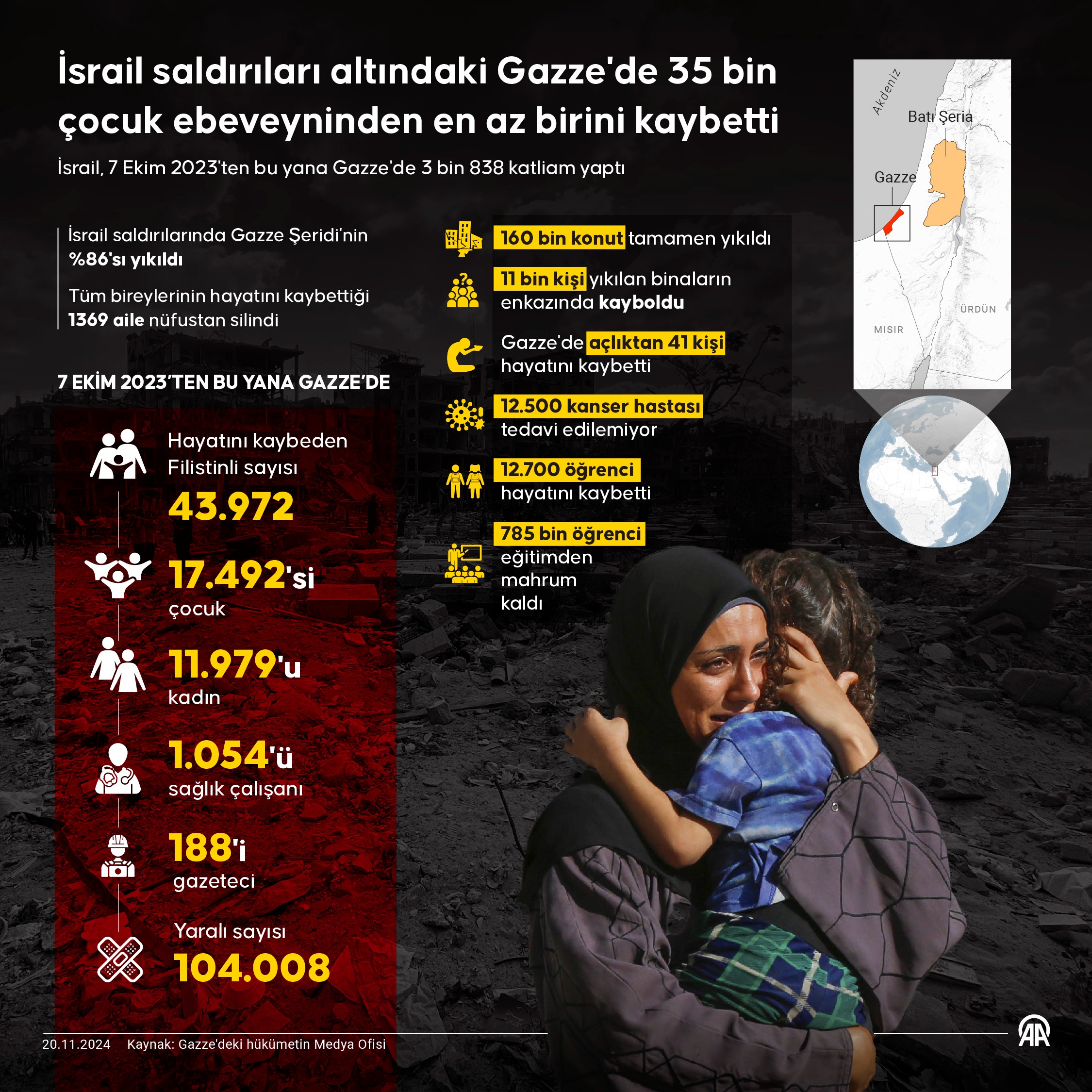 İsrail saldırıları altındaki Gazze'de 35 bin çocuk ebeveyninden en az birini kaybetti İsrail, 7 Ekim 2023'ten bu yana Gazze'de 3 bin 838 katliam yaptı.