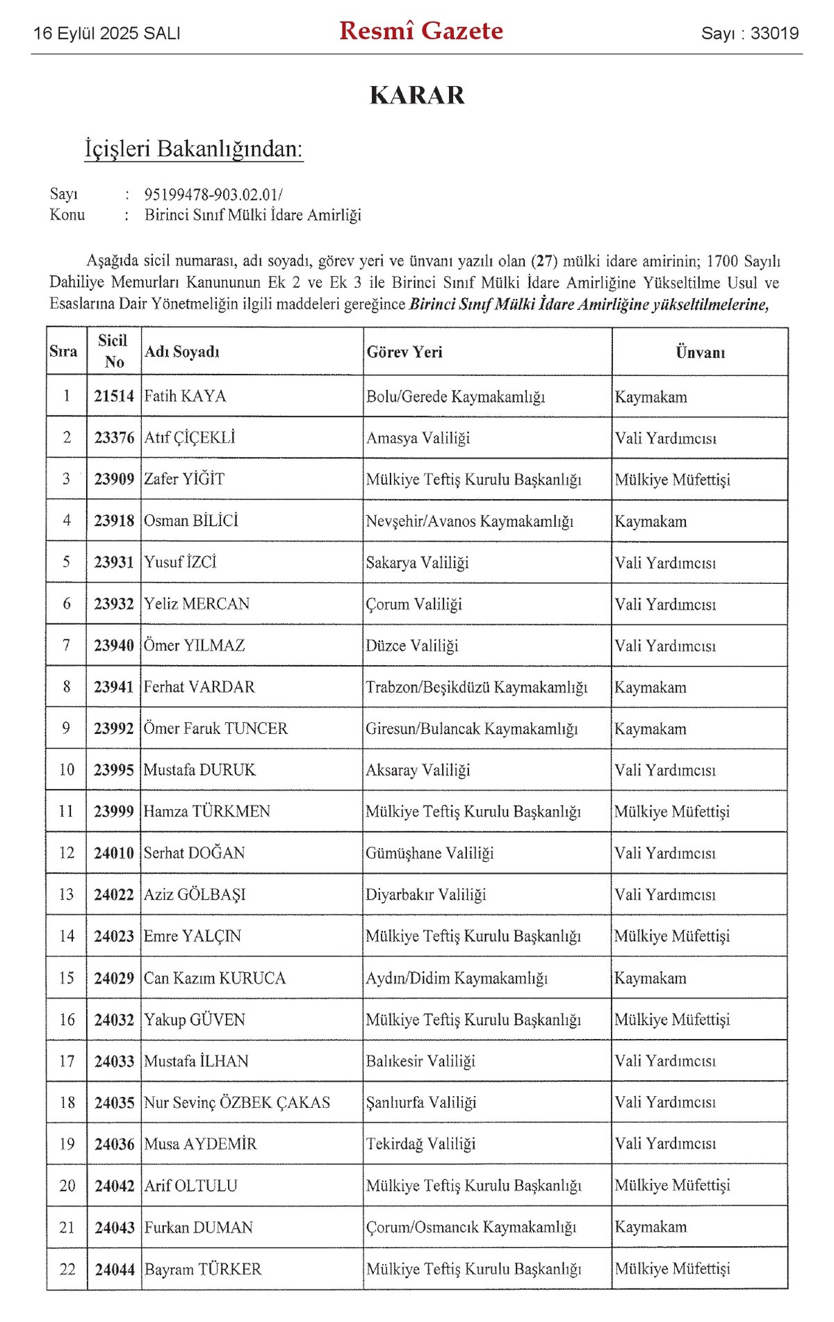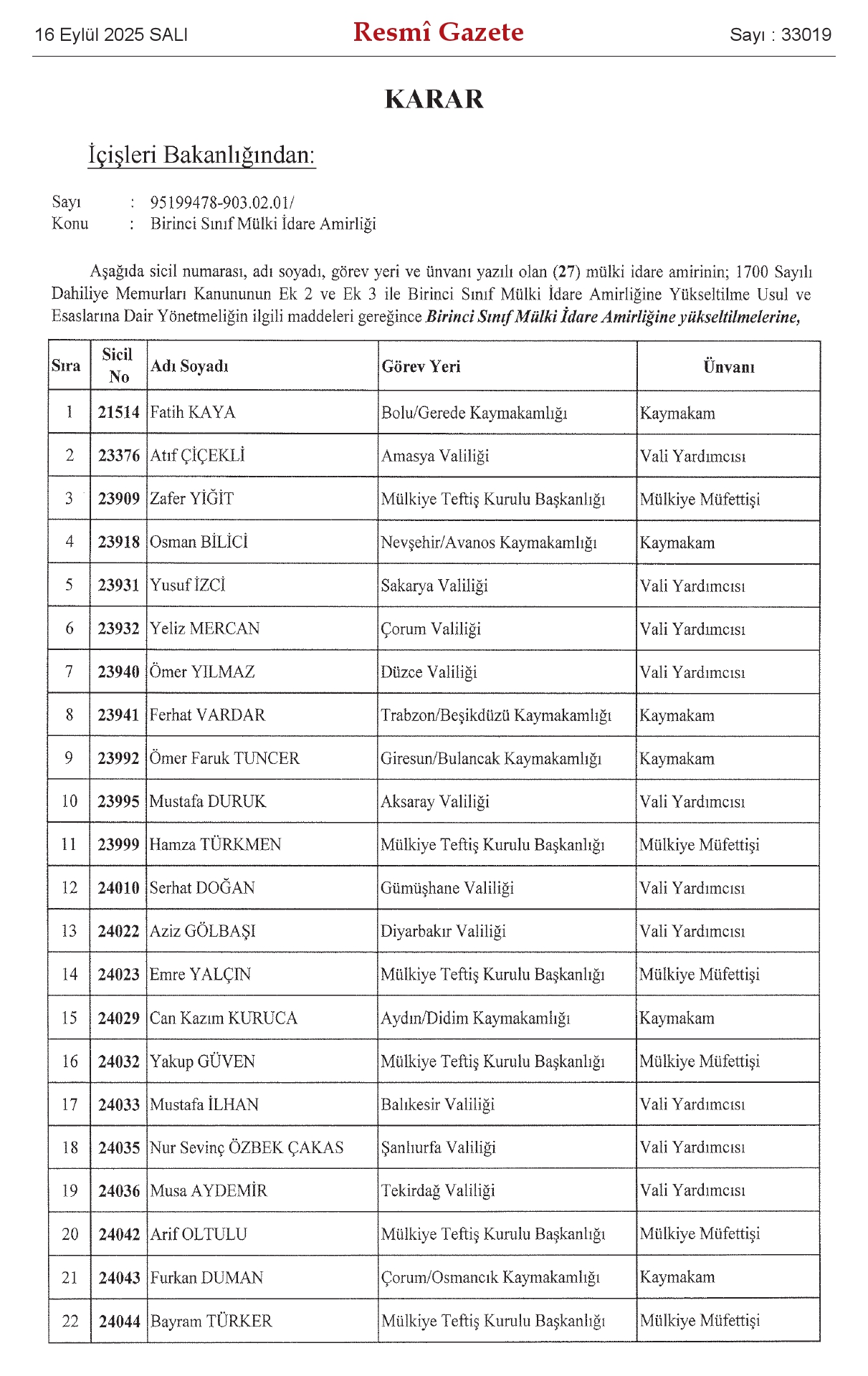 1700 Sayılı Dahiliye Memurları Kanunu'na ve ilgili yönetmeliklere dayanılarak alınan bu kararla, toplam 27 mülki idare amiri Birinci Sınıf Mülki İdare Amirliği statüsüne yükseltildi. Terfi eden amirlerin listesi, Resmi Gazete'de yayımlanarak kamuoyuna duyuruldu.