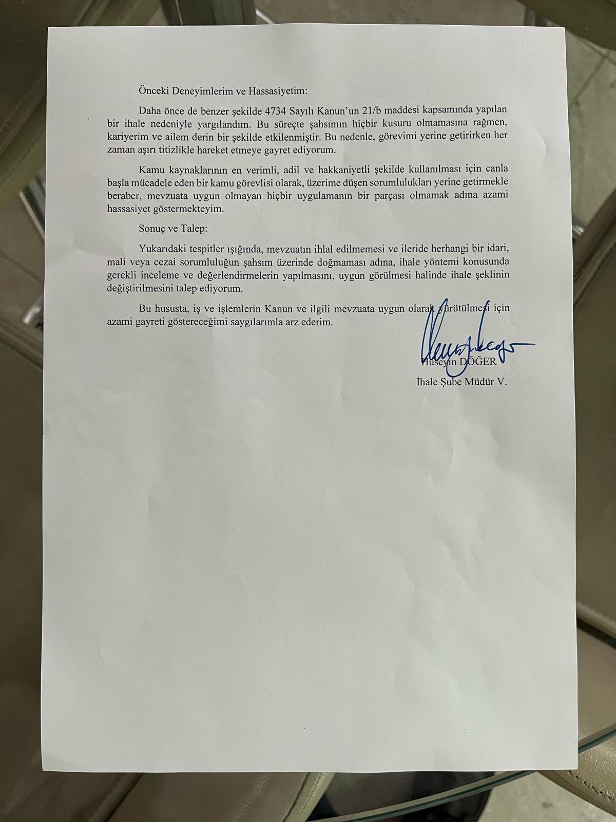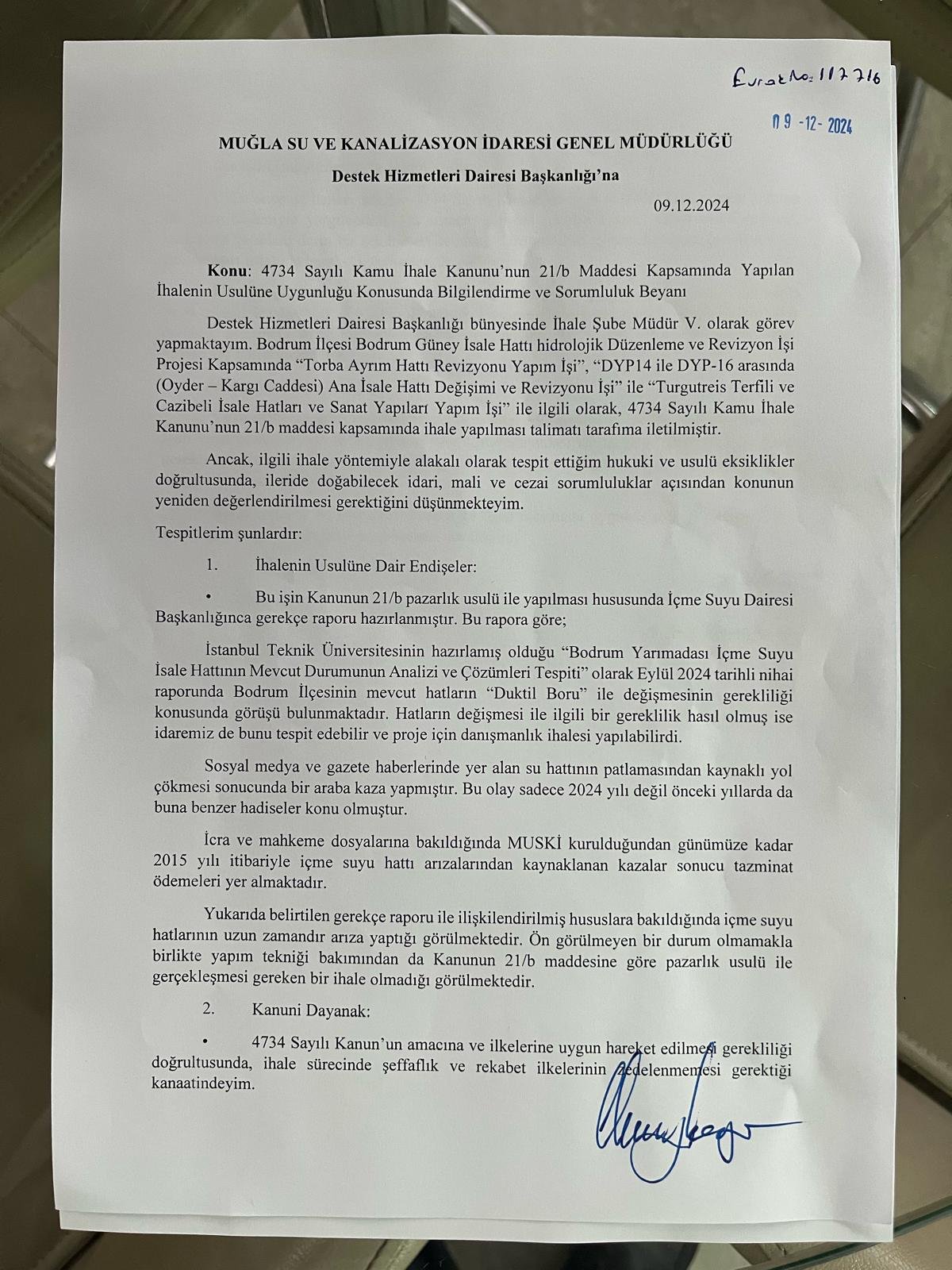 2024 yılı Ekim ayında 268 milyon TL bedelle açık ihale yapılması planlanan proje, Aras’ın talimatıyla 21/B pazarlık usulüne çevrildi. Yaklaşık maliyet belirleme komisyonunun başındaki inşaat mühendisi M.B., yeni bedelin piyasa koşullarına aykırı olduğunu raporladı. Ancak bu itiraz üzerine M.B., diğer komisyon üyeleriyle birlikte Muğla Çevre Şehircilik İl Müdürlüğü’ne geçici görevle gönderildi.