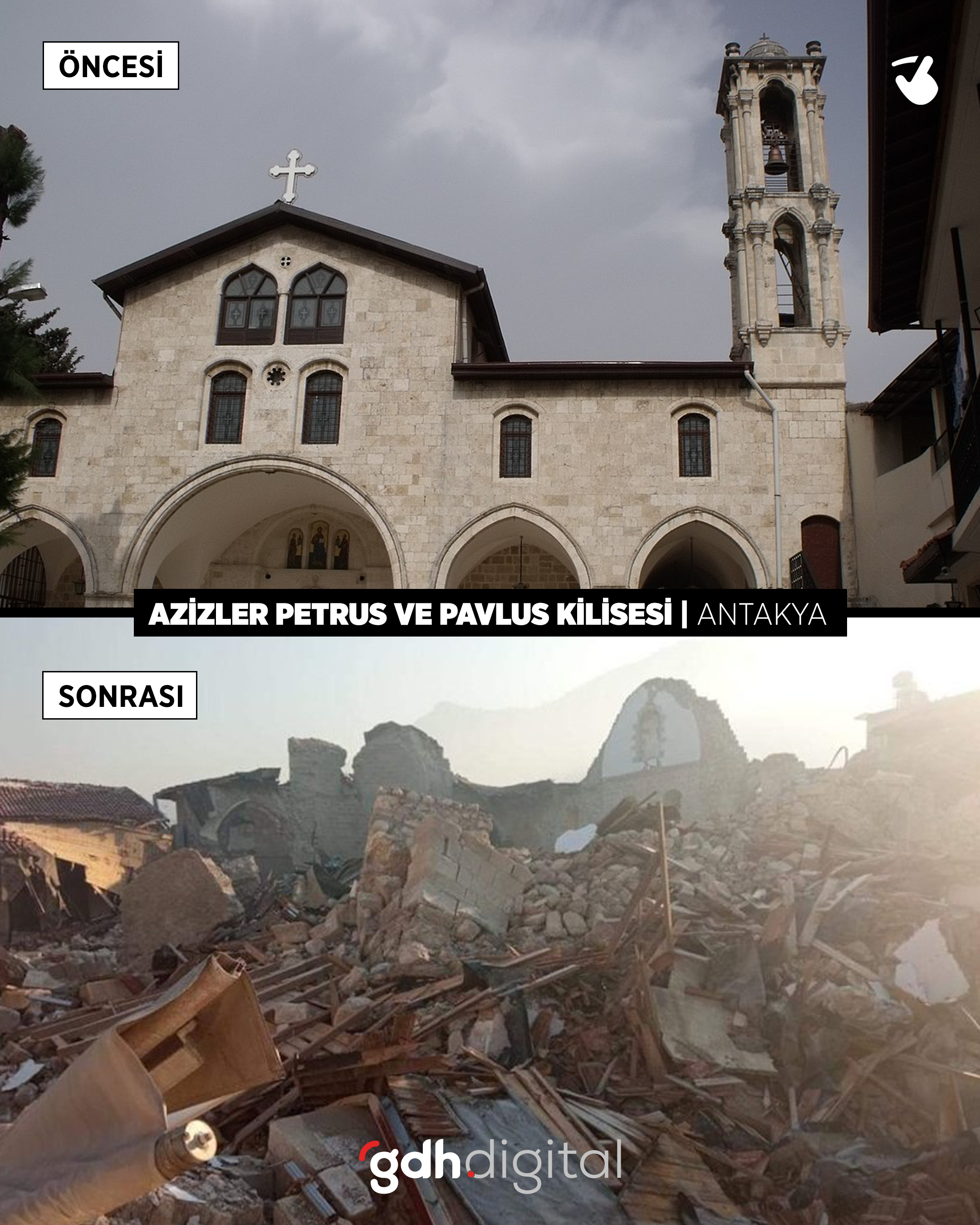 Antakya'nın Hürriyet Caddesi’nde yer alan Azizler Petrus ve Pavlus Rum Ortodoks Kilisesi’nin yapımına 1830’lu yıllarda başlandı. Ancak 1872 depreminde büyük hasar görerek yıkıldı. Kilise yeniden inşa edilerek 1900’de ibadete açıldı. Şimdiki kilise binası, yanmış olan kilisenin yerine yapılmış taş yontusu ustalığı ile Bizans Mimari Tarzının çok iyi bir örneğini yansıtıyordu. Kilise 2023 depreminde tamamen yıkıldı.