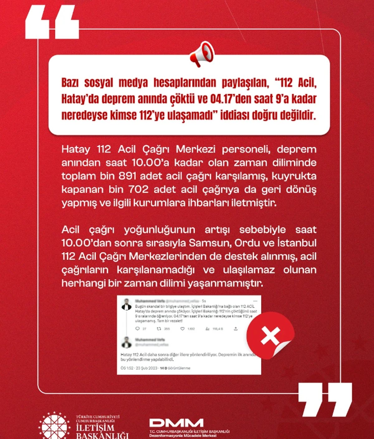 6- Hatay’da Meydana Gelen Depremin Ardından 112 Acil Çöktü İddiası: Hatay’daki 112 Acil Çağrı Merkezi, depremin ardından gece boyunca faaliyetlerini aralıksız sürdürdü. Dahası yoğun aramalar dolayısıyla bazı şehirlerdeki Acil Çağrı Merkezlerinden de destek alındı.