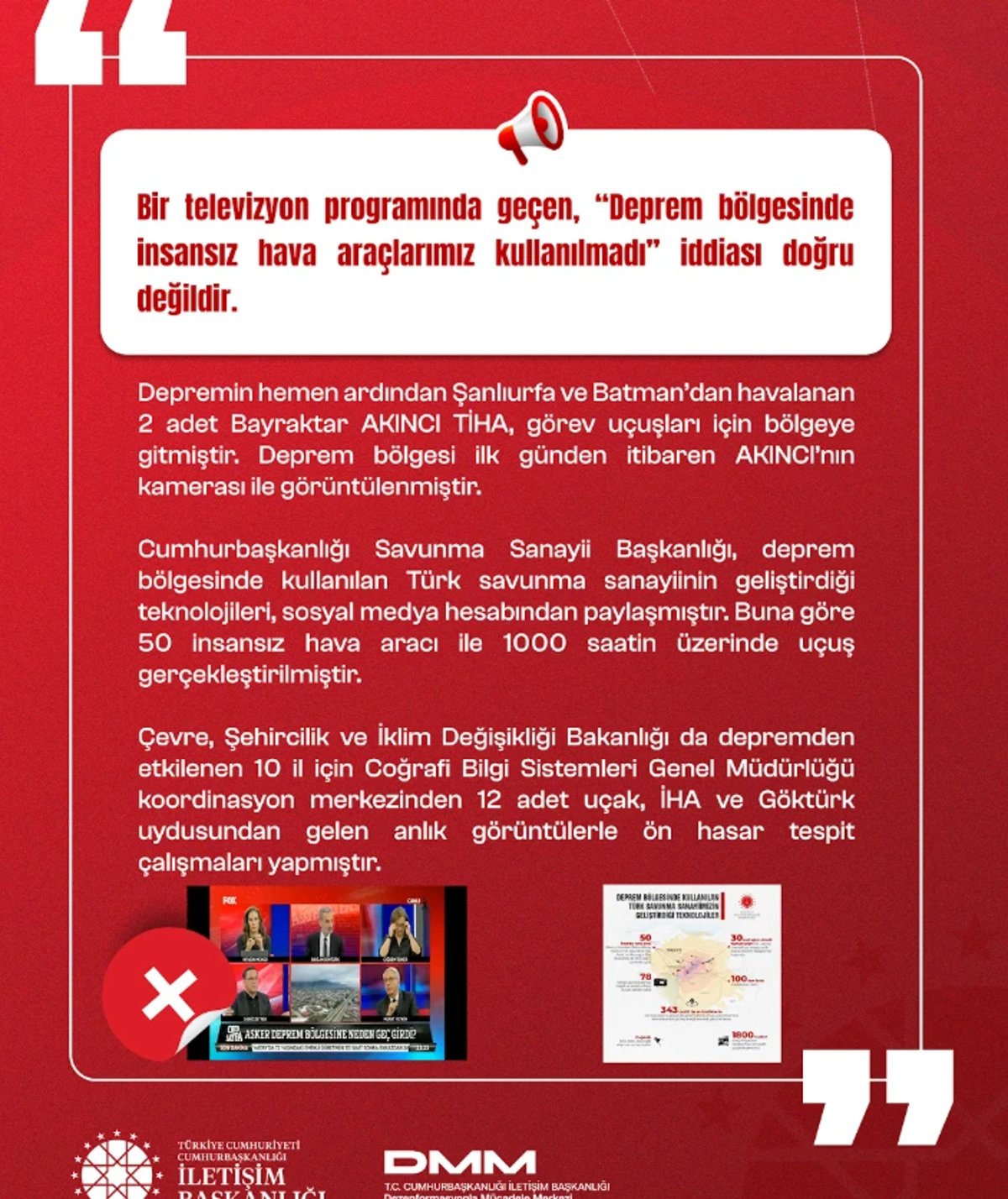 8- Deprem Bölgesinde İnsansız Hava Araökarunuzu Kullanılmadı İddiası: Depremin hemen ardından Şanlıurfa ve Batman’dan 2 adet Bayraktar AKINCI TİHA’nın görev aldığı, deprem bölgesinin ilk günden itibaren AKINCI’nın kamerası ile görüntülendiği ortaya çıktı. Ayrıca 50 insansız hava aracı ile 1000 saatin üzerinde uçuş gerçekleştirdi.
