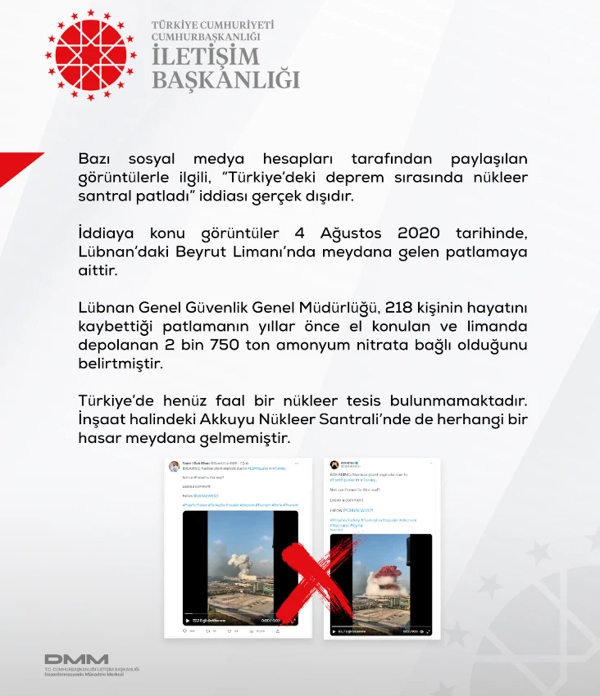 3- Türkiye’deki Deprem Sırasında Nükleer Santral Patladı İddiası: Lübnan Beyrut: Lübnan Beyrut limanındaki bir patlama görüntüsüyle servis edilen iddia asılsız çıktı. Türkiye’de ki nükleer santraller henüz faal bile değildi. Herhangi bir patlama da yoktu.
