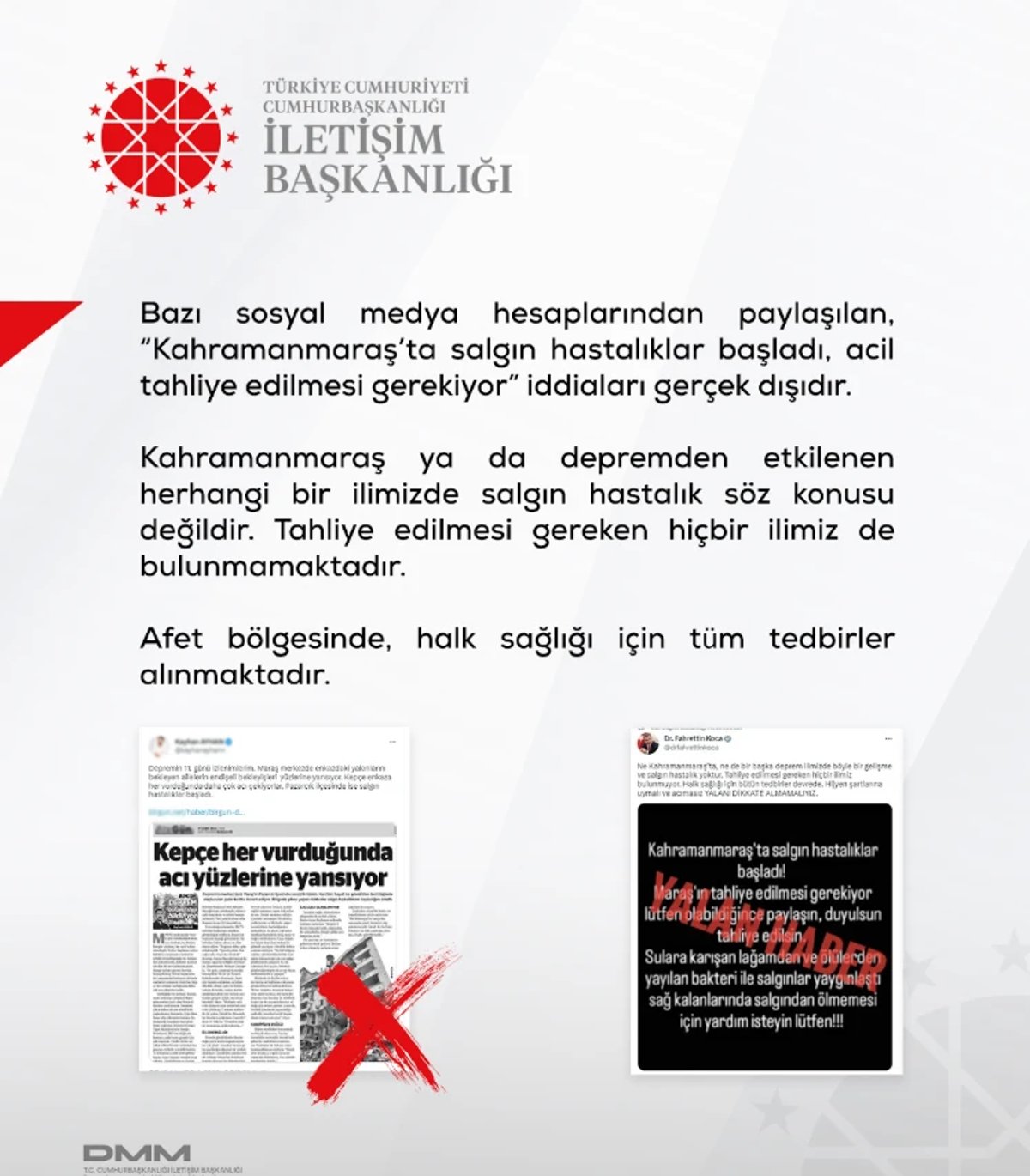 - İletişim Başkanlığı Dezenformasyonla Mücadele Merkezi (DMM), sistematik bültenler yayımlayarak yalan haberlerin etkisini sınırlamada merkezi bir rol üstlenmiştir.