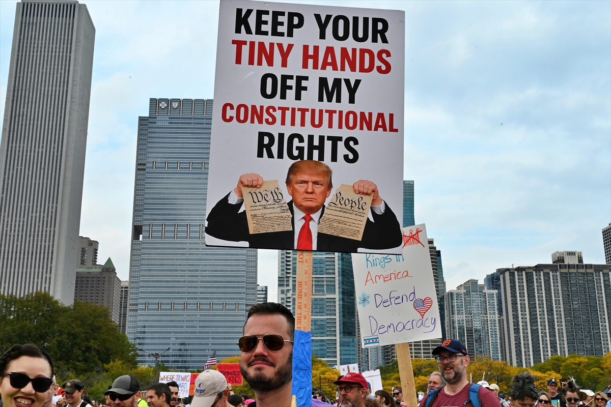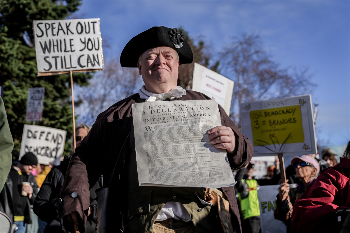 Protestocular, Trump yönetiminin vatandaşların anayasal haklarını ihlal ettiğini öne sürerek “Demokrasiyi savunun” sloganları attı.
