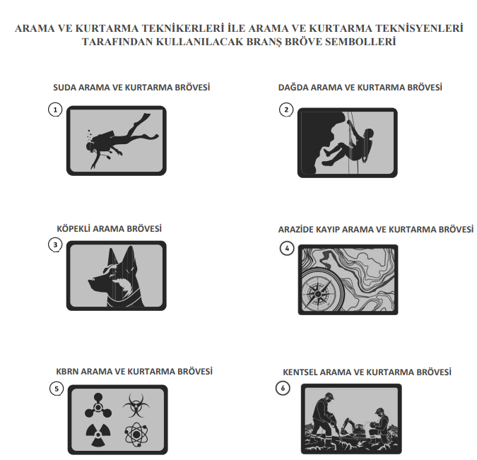 Yönetmeliğe göre, arama ve kurtarma teknikerleri ve teknisyenleri, uzmanlaştıkları branşı belirten branş bröve sembollerini üniformalarının sol göğüs kısmına takacak. Yönetici personel, rütbe işaretlerini omuzlarına takarak kullanacak. Rütbeler, il müdürü ve il müdür yardımcısı hariç olmak üzere, birimlerin idari düzenini belirleyecek. Yetkisi olmadığı halde bu kıyafet ve işaretleri kullananlar hakkında 7126 sayılı Sivil Savunma Kanunu hükümleri uygulanacak.