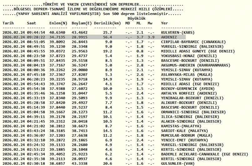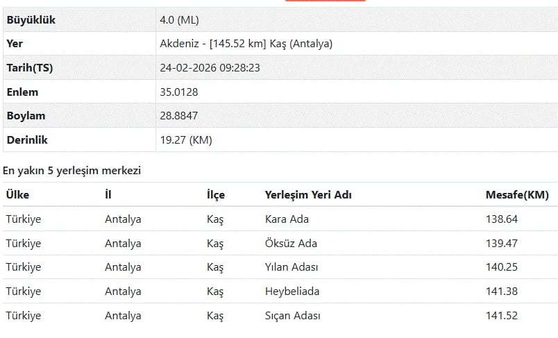 Kandilli Rasathanesi tarafından paylaşılan bilgilere göre 24 Şubat saat 09.28'de Akdeniz-Antalya açıklarında 3.9 şiddetinde bir deprem meydana geldi.