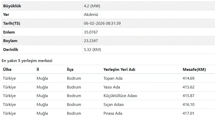 AFAD verilerine göre ise Akdeniz açıklarında 6 Şubat saat 8.31'de yerin 5.32 kilometre derinliğinde 4.2 şiddetinde bir deprem meydana geldi.