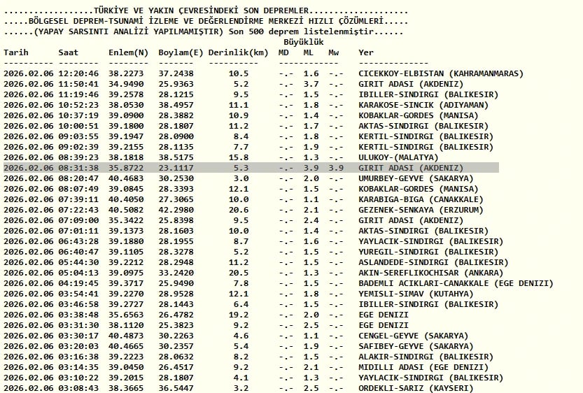 6 Şubat Akdeniz deprem bilgileri ve detayları şöyle;