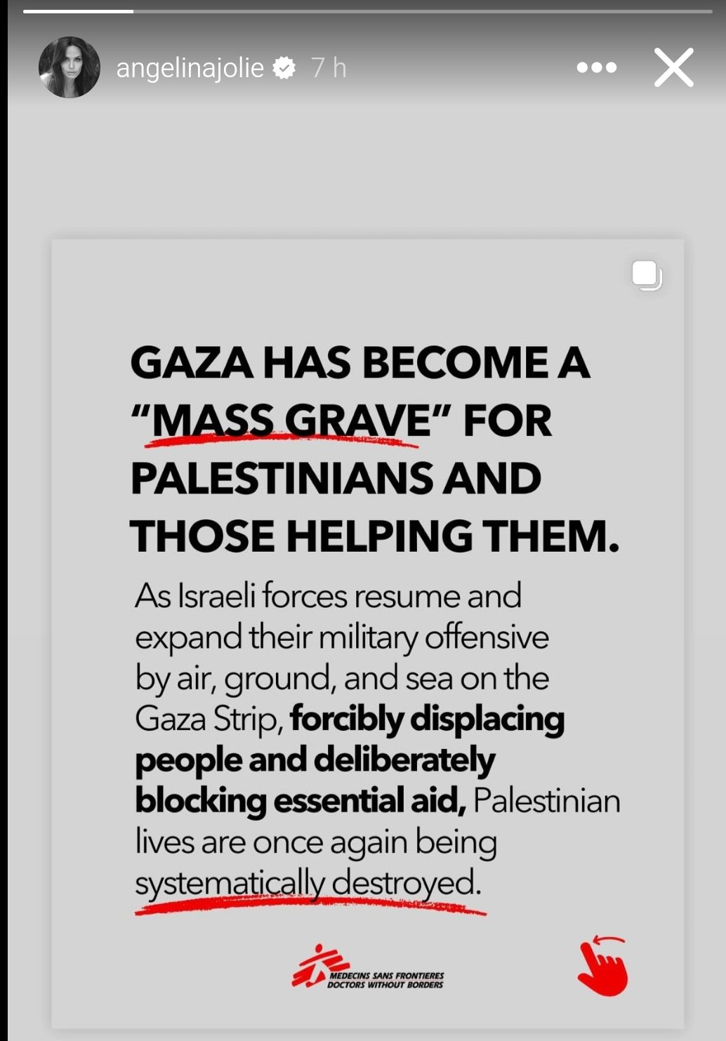 - Angelina Jolie, Sınır Tanımayan Doktorlar'ın Gazze raporunu Instagram'da paylaşarak destek verdi.