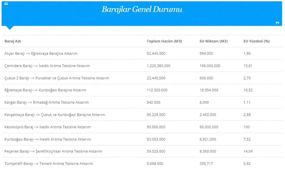 ANKARA BARAJLARI DOLULUK ORANLARI NE KADAR?