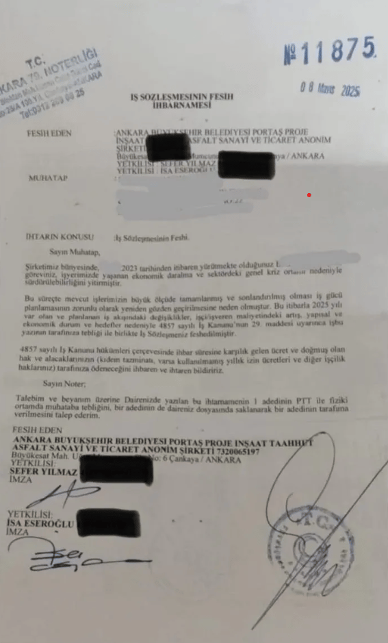 PORTAŞ A.Ş. tarafından işçilere gönderilen fesih yazılarında, iş akdinin sona erdirilmesine gerekçe olarak şirketin içinde bulunduğu ekonomik daralma, iş gücü planlaması ve iş yükündeki azalma gösterildi. İhbarnamede, "Şirketimiz bünyesinde 2023 tarihinden itibaren yürütmekte olduğunuz göreviniz, iş yerimizde yaşanan ekonomik daralma ve sektördeki genel kriz ortamı nedeniyle sürdürülebilirliğini yitirmiştir" ifadeleri yer aldı. Ancak bu durum, seçim döneminde belediye eliyle yapılan yüksek sayıdaki işe alımların "seçim odaklı ve geçici" olup olmadığı tartışmalarını başlattı.