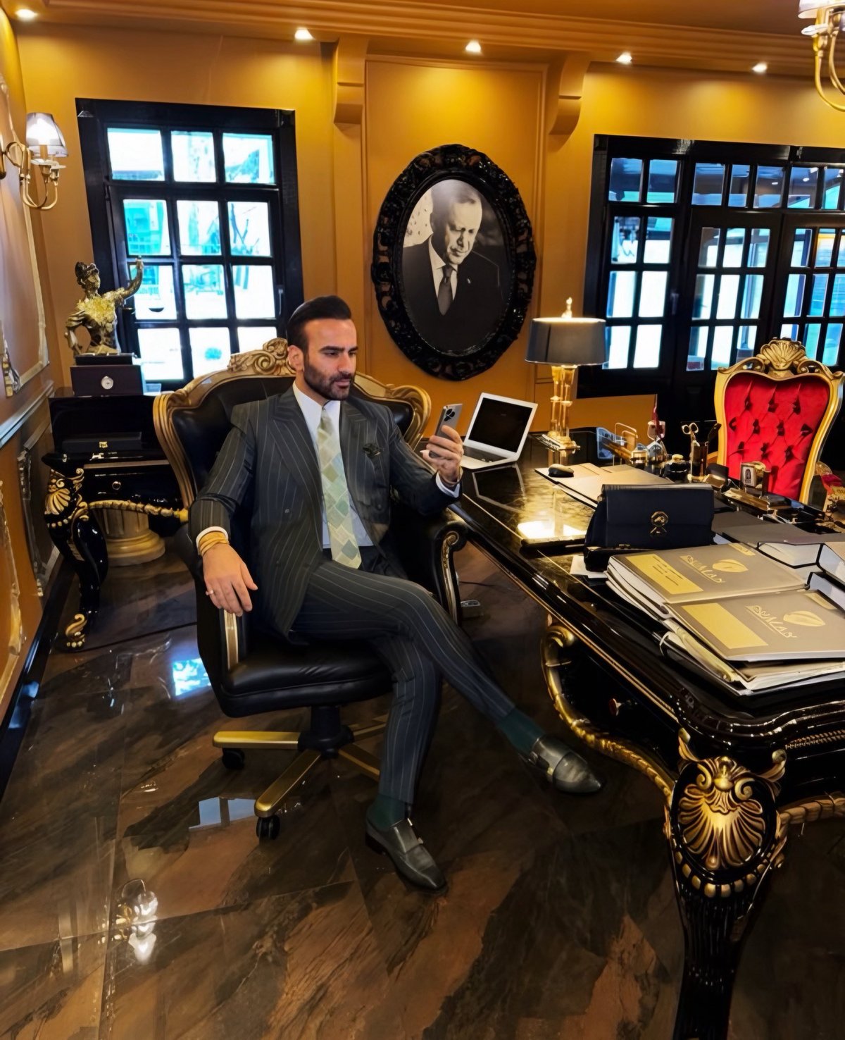 Düzenlenen operasyonda gözaltına alınan ve altın varaklı avukat olarak bilinen, çetenin avukatı Cem Duman’ın Cumhurbaşkanı Erdoğan’ın portresini odasına astığı ve çektiği videolarla Cumhurbaşkanlığına sık sık atıf yaptığı da tespit edildi.