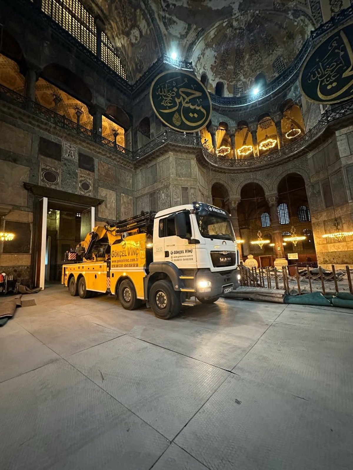 - Ayasofya'daki restorasyon sırasında, her biri 45 ton ağırlığında olan iki vinç yapının içine sokuldu.