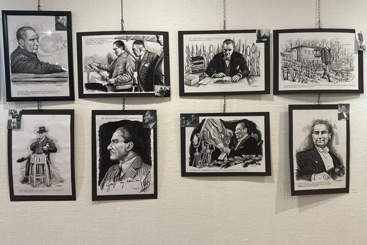Kara kalem tekniğiyle hazırlanan sergi, Atatürk’ün hayatından kesitleri detaylı çizimlerle aktarıyor.