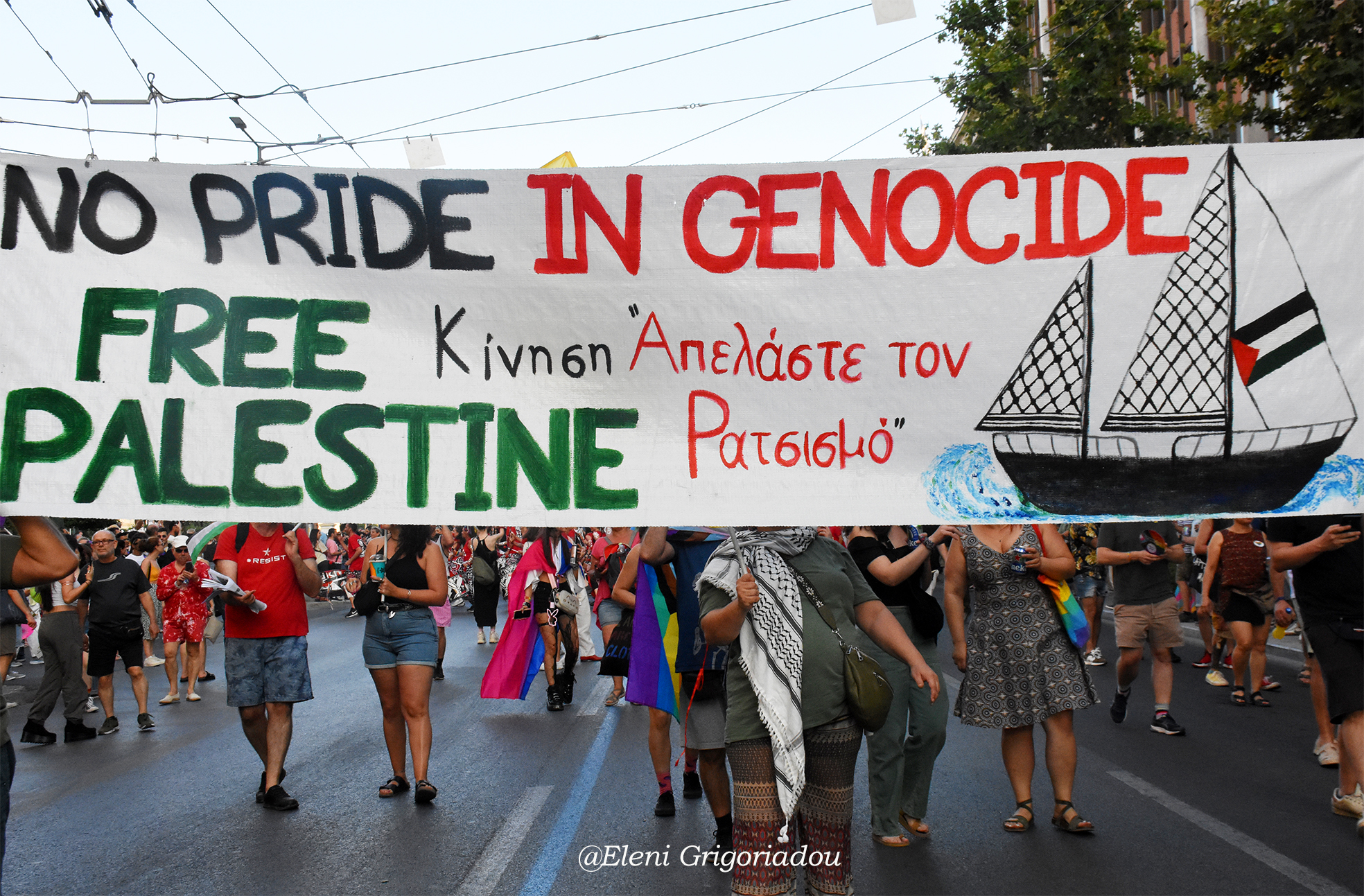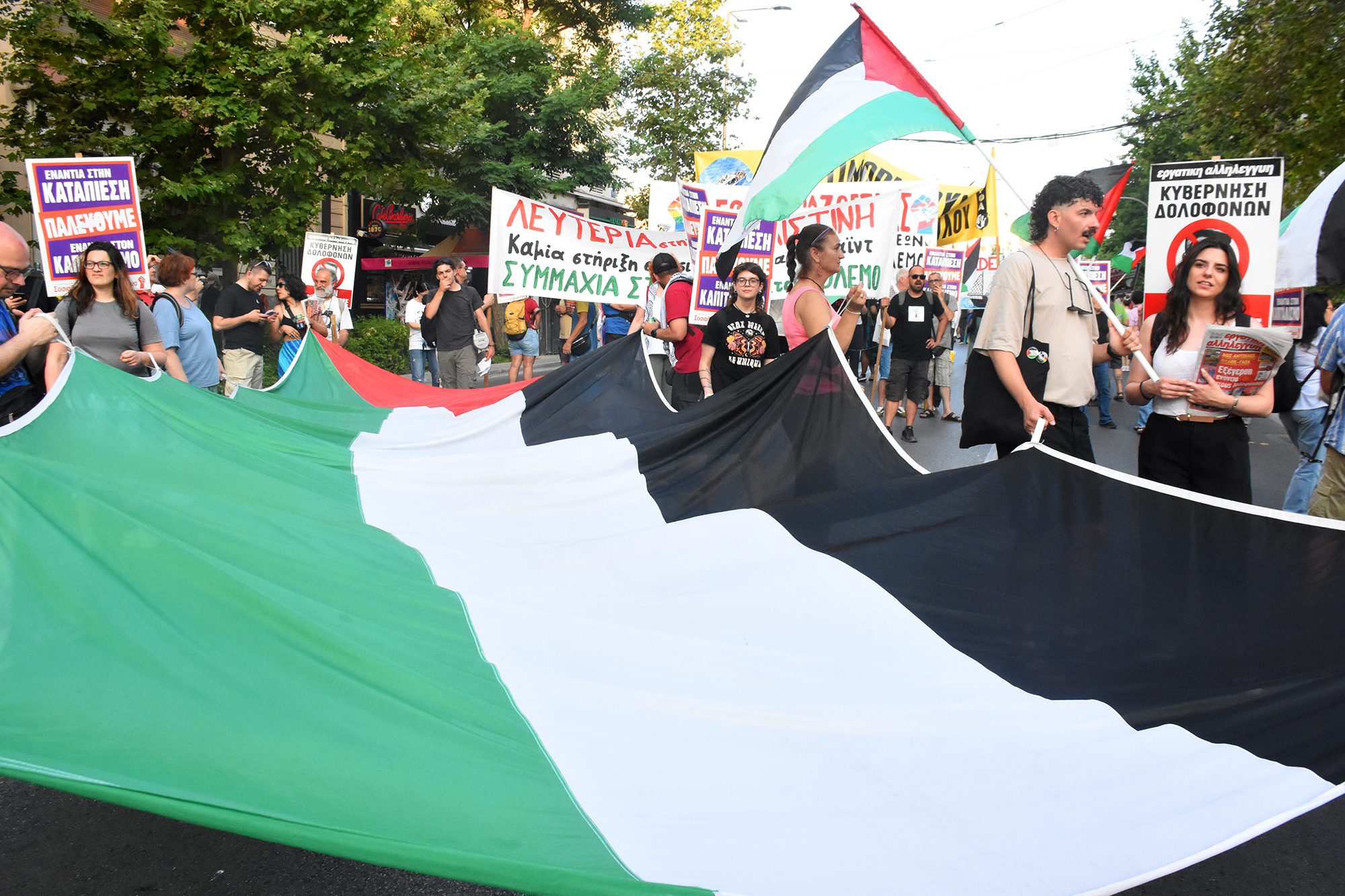 Filistin bayrağı açan ve slogan atan eylemcilere polis müdahale etti. Grup tarafından yapılan açıklamaya göre, "March to Gaza Greece" üyelerinden bazıları bu nedenle gözaltına alındı. Grup, gözaltı sırasında tarihe karşı görevlerini yerine getirdiklerini vurguladı.