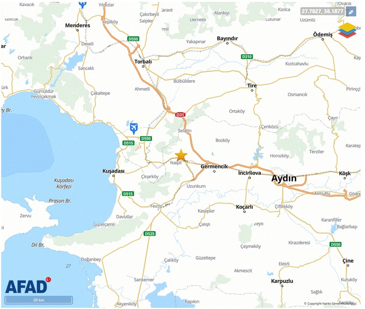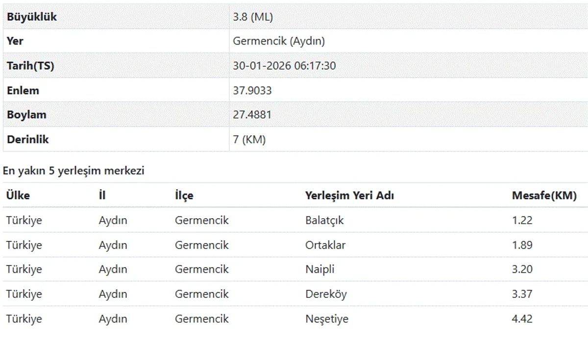 Kandilli Rasathanesi son depremler listesinden edinilen bilgiye göre 30 Ocak Cuma günü Aydın'ın Germencik ilçesinde 3.8 şiddetinde bir deprem meydana geldi.