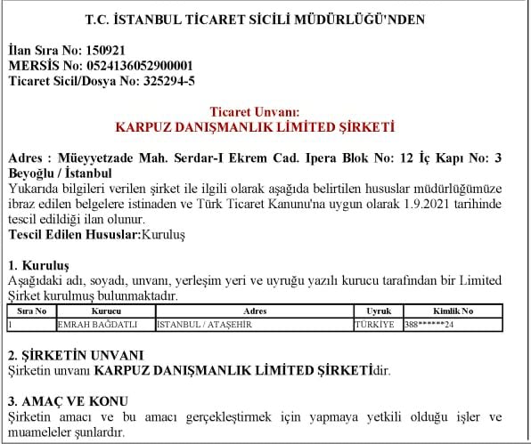 BDDK raporunda adı geçen Karpuz Danışmanlık, 1 Eylül 2021’de Beyoğlu’nda kuruldu. Şirketin tek hissedarı olarak Emrah Bağdatlı görülüyor.