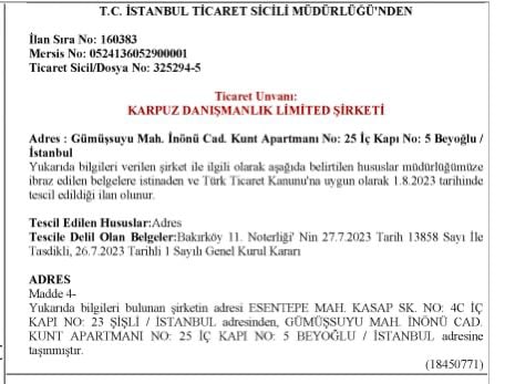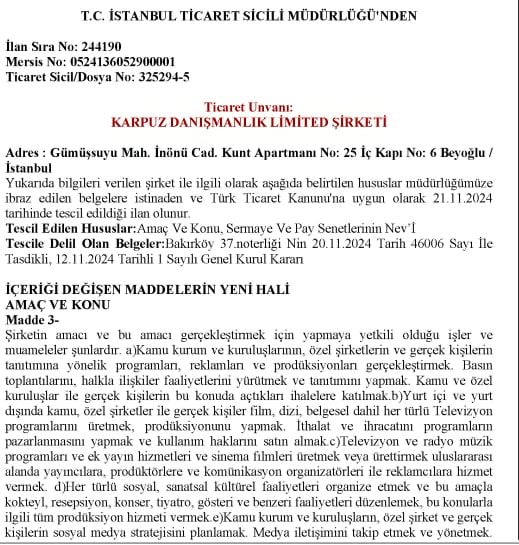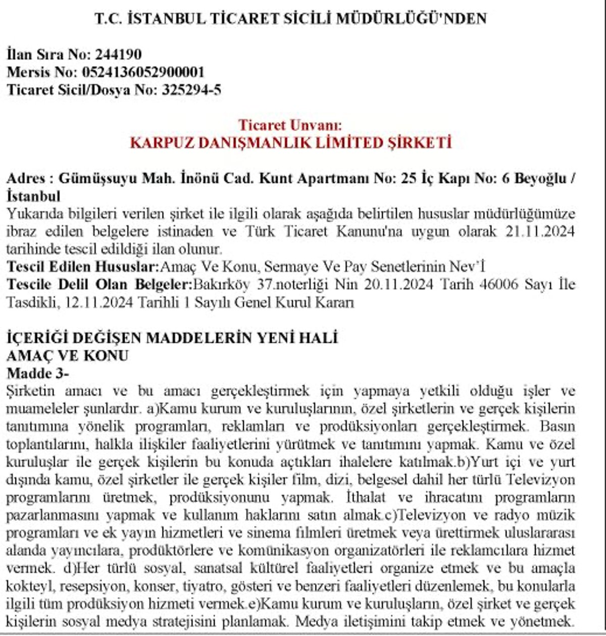 2022’de Şişli Esentepe’ye, 2023’te ise Gümüşsuyu’na taşınan şirket, 21 Kasım 2024’te amaç ve konu değişikliğine gitti.