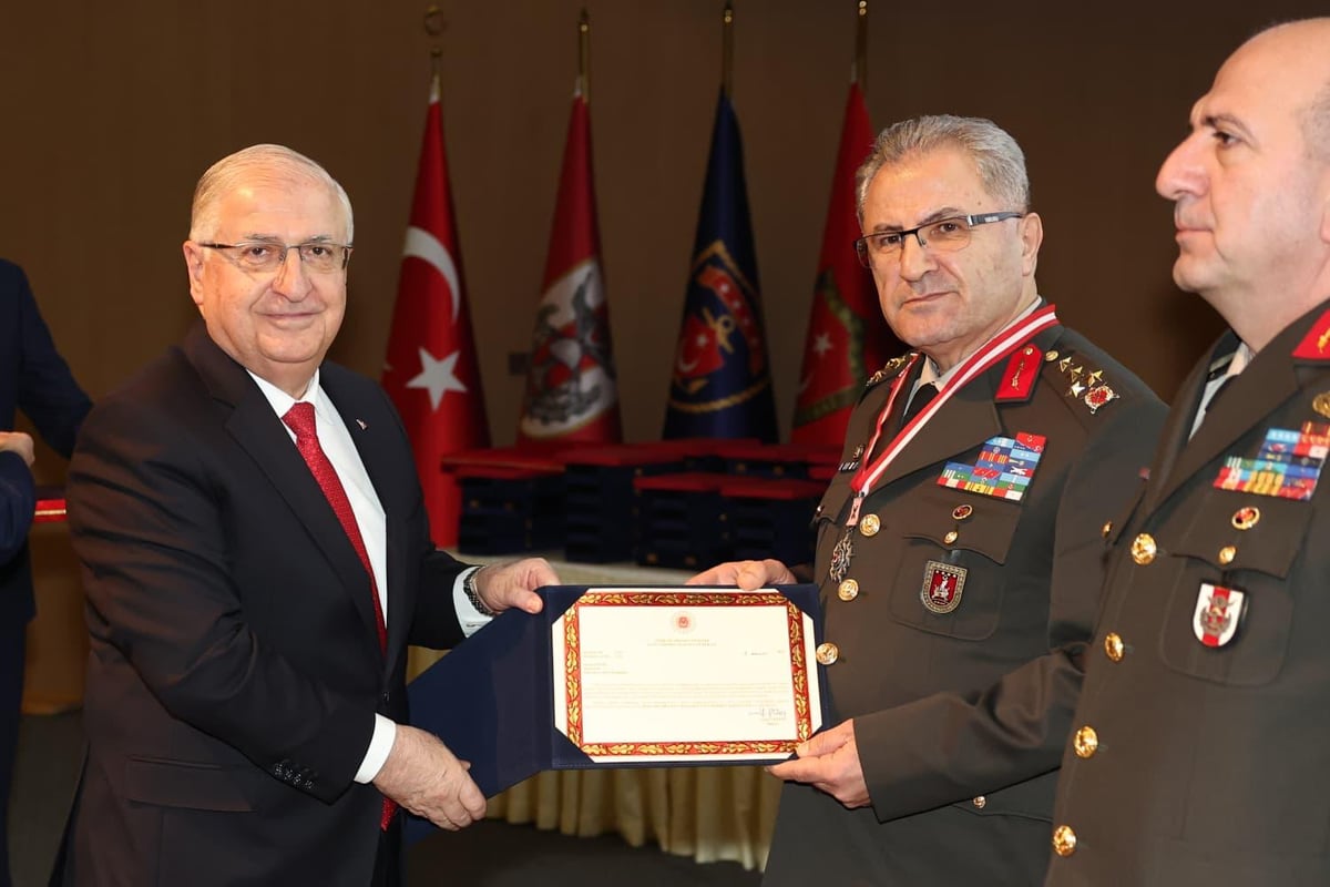 Bakan Yaşar Güler, Genelkurmay Başkanı Orgeneral Selçuk Bayraktaroğlu ve Hava Kuvvetleri Komutanı Orgeneral Ziya Cemal Kadıoğlu’na TSK Şeref Madalyası ve Beratı takdim etti.