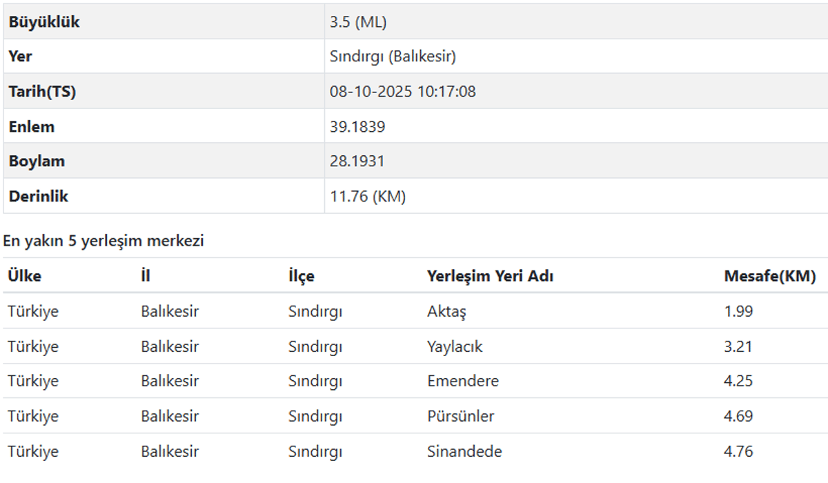 AFAD son depremler listesi verilerine göre ise Balıkesir Sındırgı’da meydana gelen depremin derinliği 11.76 kilometre, şiddeti ise 3.5 olarak duyuruldu.