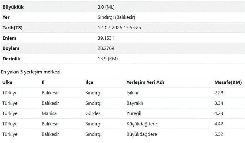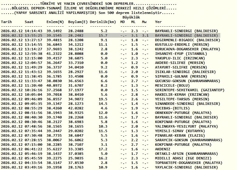 12 Şubat AFAD ve Kandilli Rasathanesi son depremler listesi verileriyle Balıkesir depremi merkez üssü ve şiddet detayları şöyle;