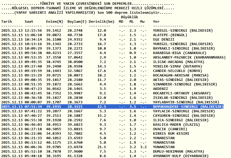 BALIKESİR DEPREM VERİLERİ