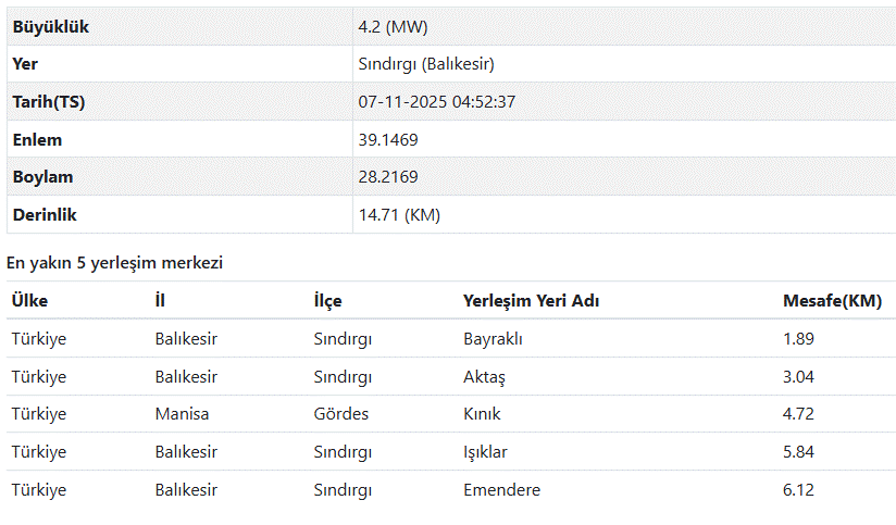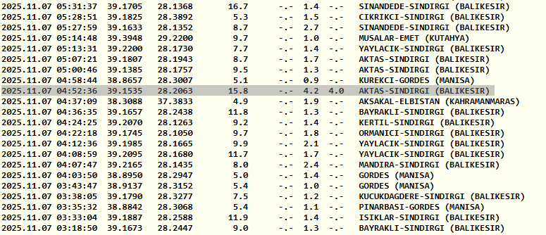 AFAD BALIKESİR DEPREM VERİLERİ
