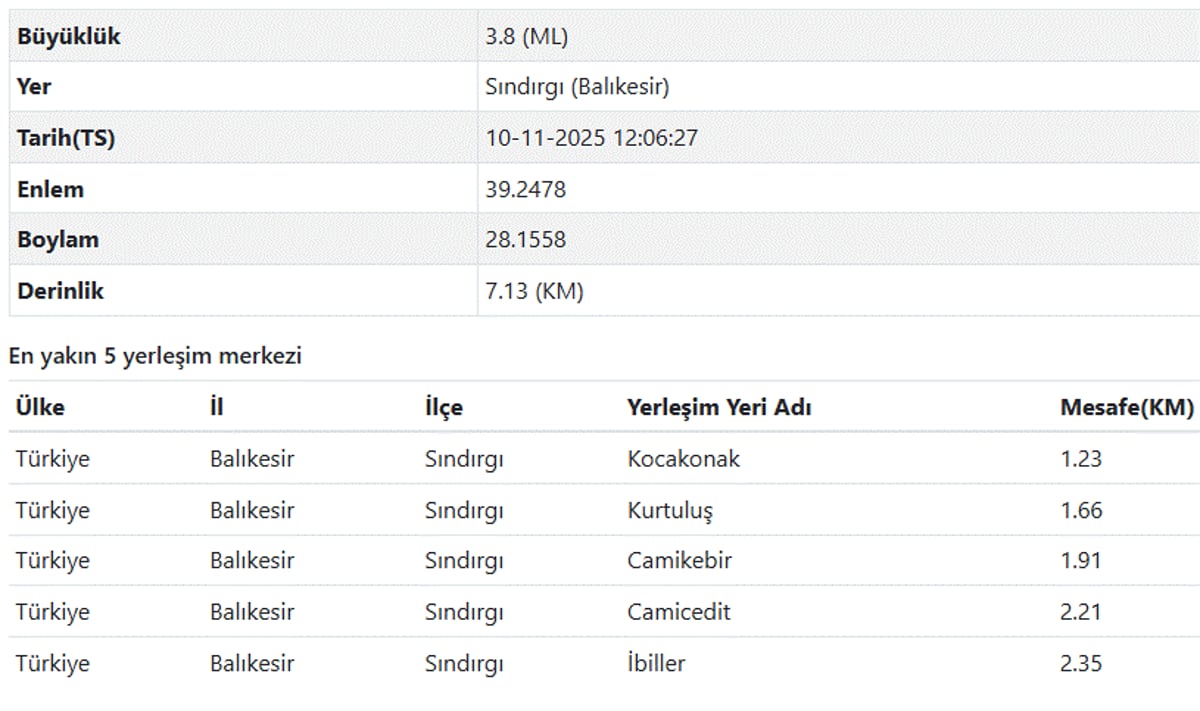 Balıkesir depremine ilişkin AFAD tarafından yayımlanan verilere göre ise Balıkesir Sındırgı'da meydana gelen deprem saat 12.06'da yerin 7.13 kilometre derinliğinde 3.8 şiddetinde meydana geldi.