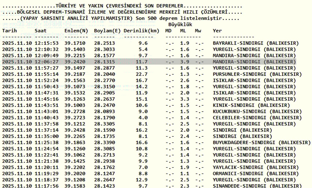 SON DAKİKA BALIKESİR DEPREM VERİLERİ