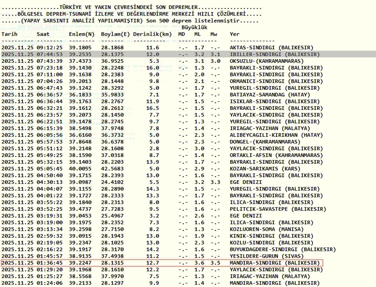 25 Kasım AFAD ve Kandilli Rasathanesi son depremler listesi verileriyle Balıkesir deprem detayları şöyle;