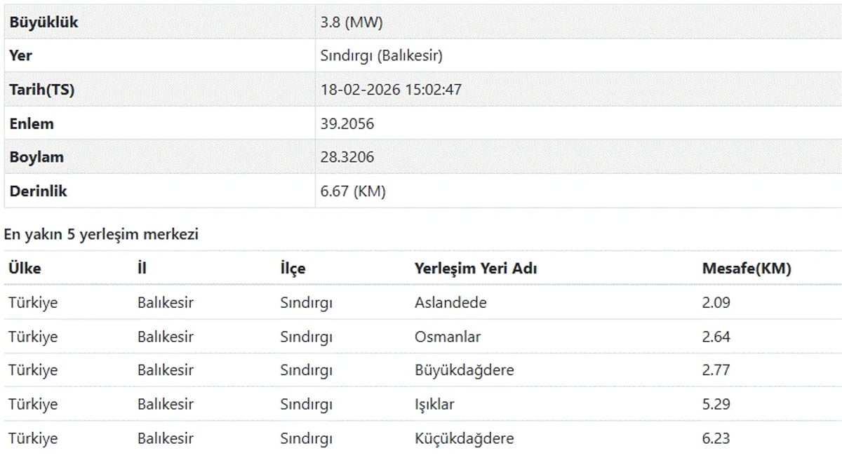 Kandilli Rasathanesi verilerine göre ise 18 Şubat günü saat 15.02'de Balıkesir Sındırgı'da yerin 13.3 kilometre derinliğinde meydana gelen depremin şiddeti 3.7 olarak ölçüldü.