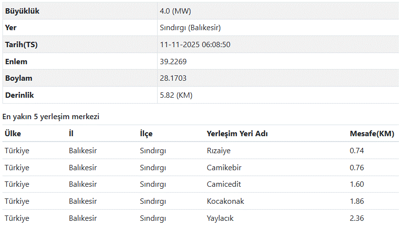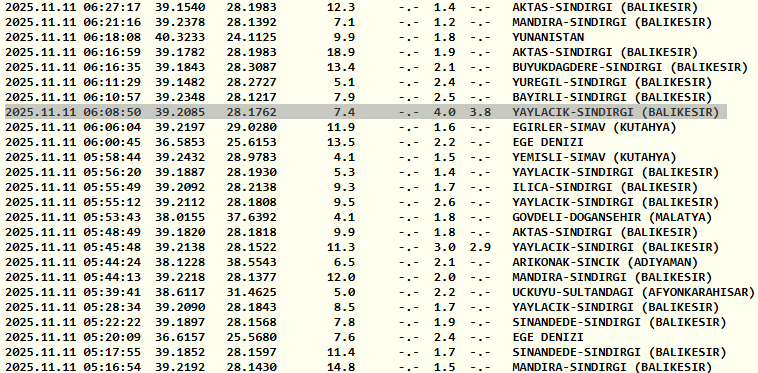 11 Kasım AFAD ve Kandilli Rasathanesi Balıkesir deprem verileri ve tüm detaylar şöyle;