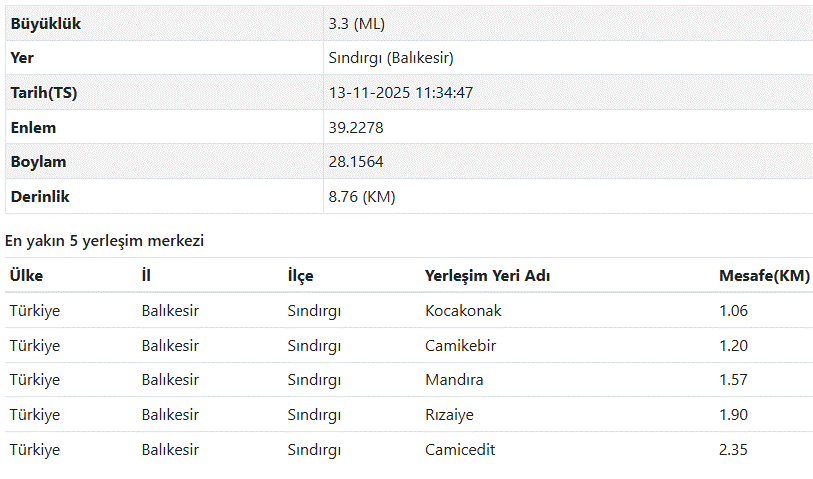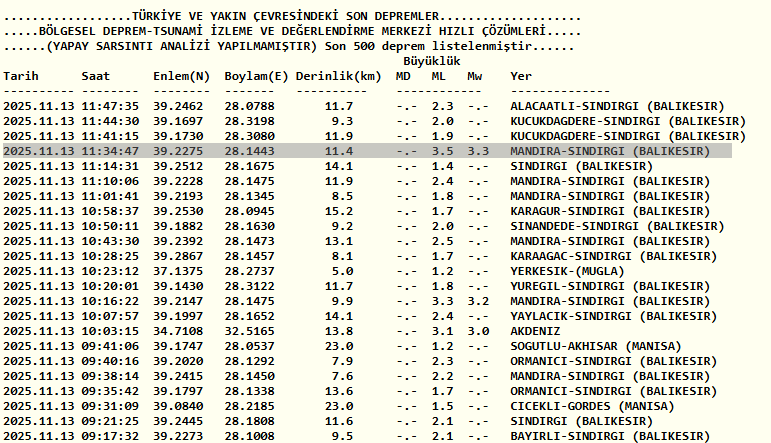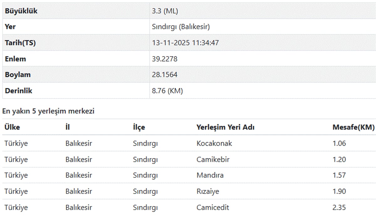 13 Kasım son depremler listesi verilerine Balıkesir deprem verileri şöyle;