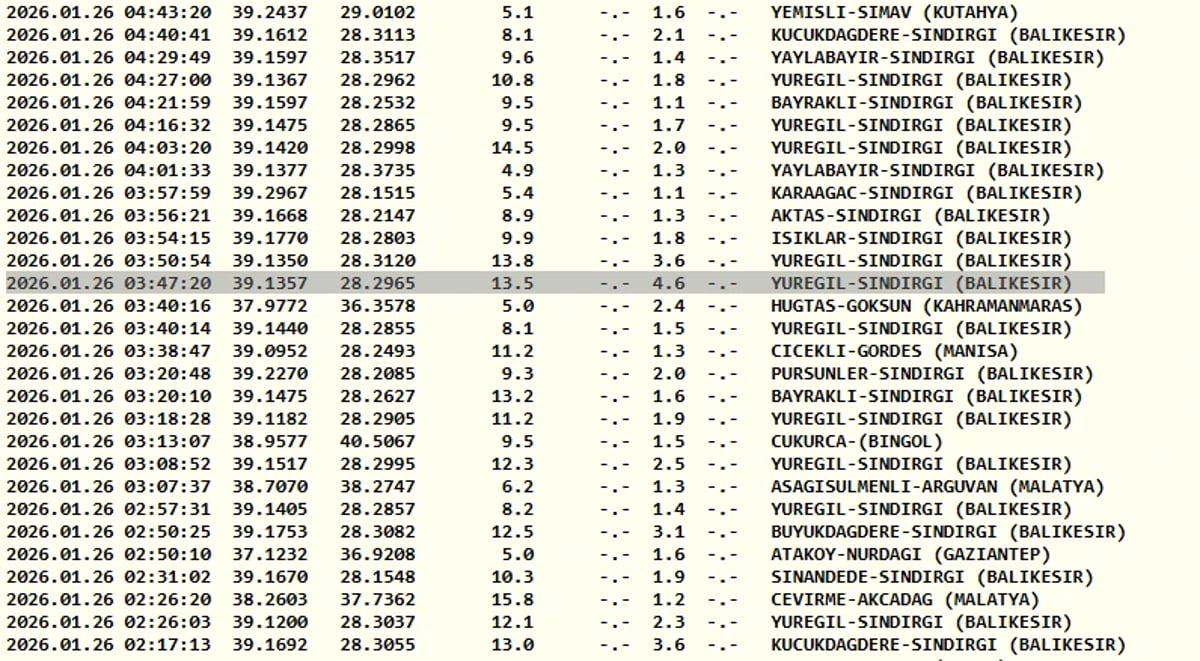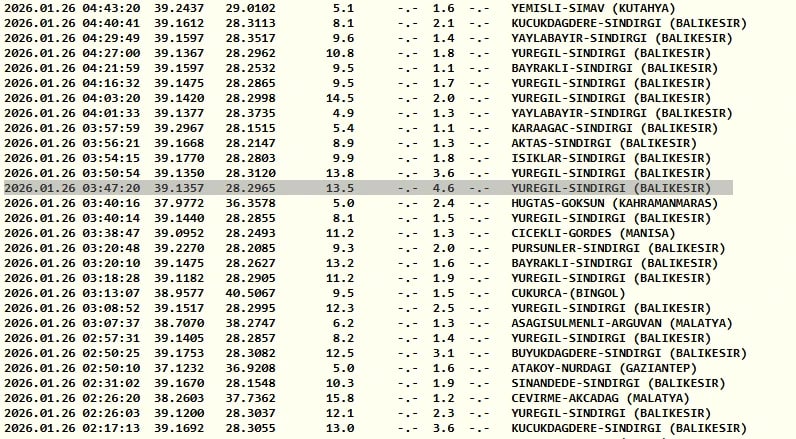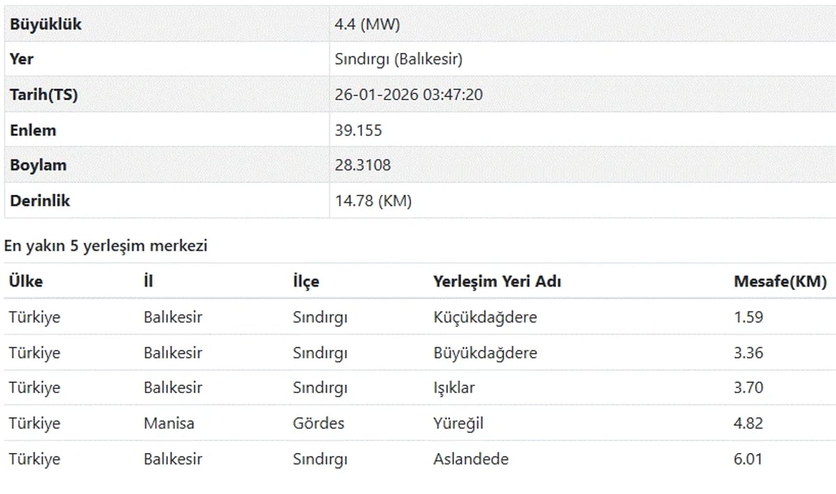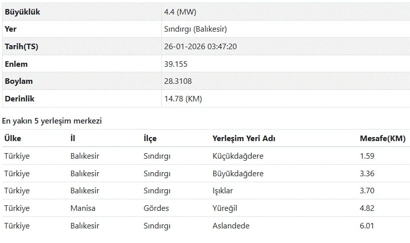 Kandilli Rasathanesi son depremler listesi verilerine göre 26 Ocak 2026 Pazartesi günü saat 3.47'de Balıkesir Sındırgı'da 4.6 şiddetinde bir deprem meydana geldi.