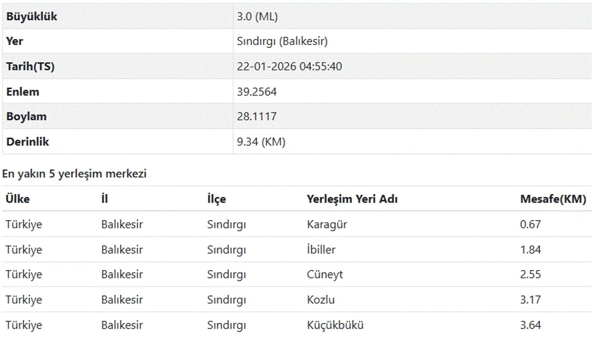 AFAD son depremler listesi verilerine göre ise 22 Ocak 2026 günü saat 4.55'te meydana gelen depremin şiddeti 3.0 olarak ölçüldü.