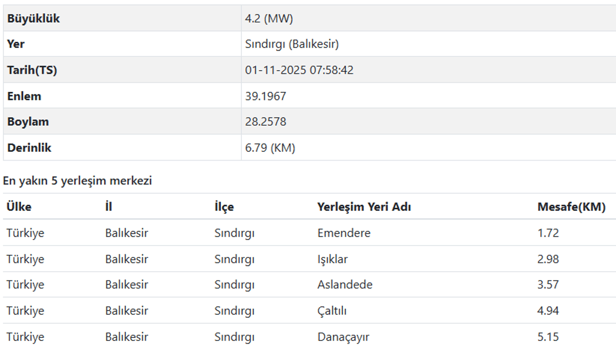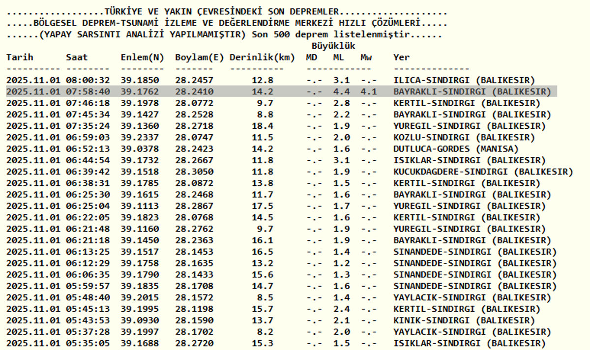 1 Kasım AFAD ve Kandilli Rasathanesi son depremler listesi verileriyle son dakika Balıkesir deprem bilgileri şöyle;