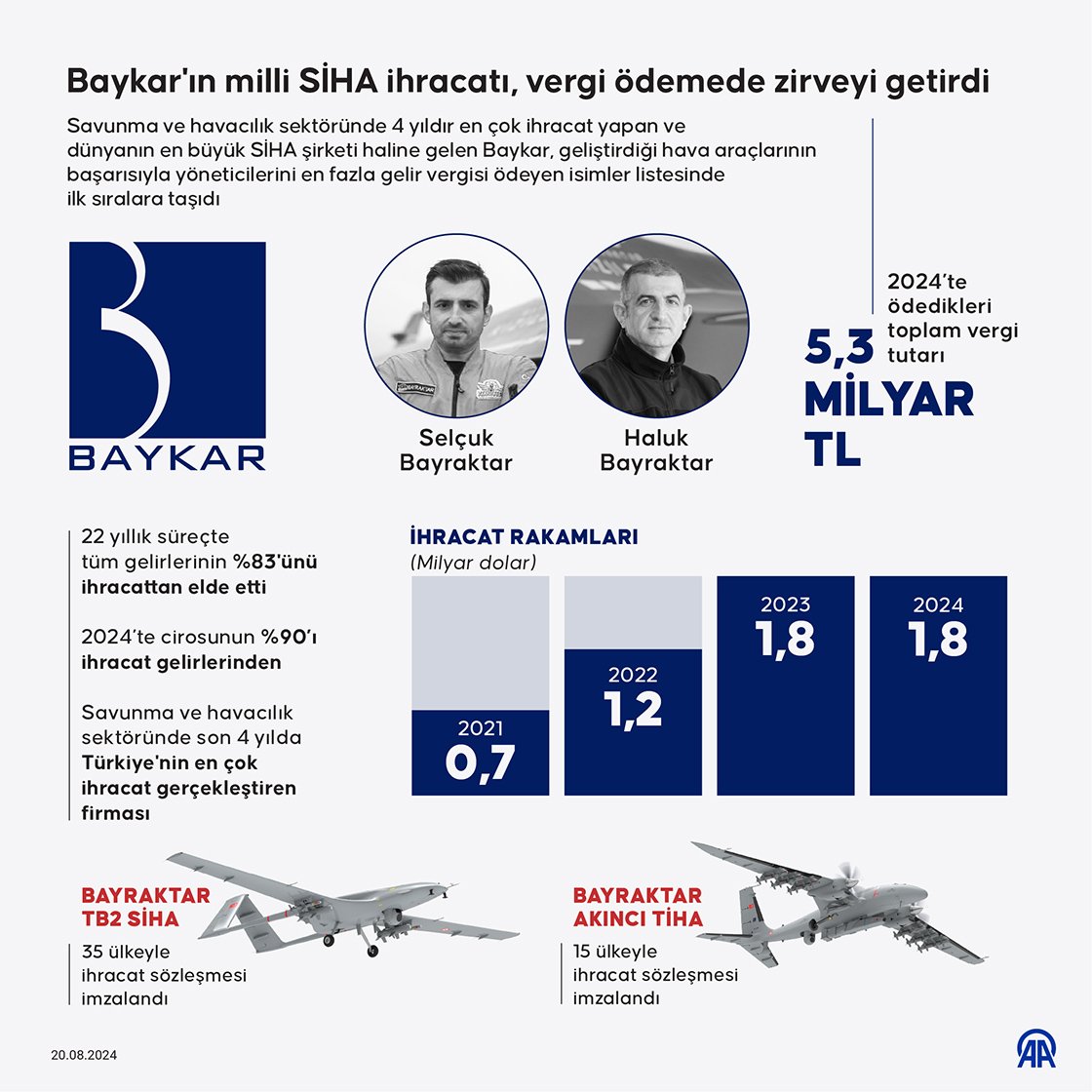 Baykar, 2021 yılında 664 milyon dolarlık ihracat yaptı. 2022'de bu rakam 1,2 milyar, 2023'te 1,8 milyar dolara çıktı. Baykar, 2024'te küresel ölçekteki başarısını sürdürdü ve gelirlerinin yüzde 90’ını ihracattan elde ederek 1,8 milyar dolarlık yurt dışı satışı gerçekleştirdi.