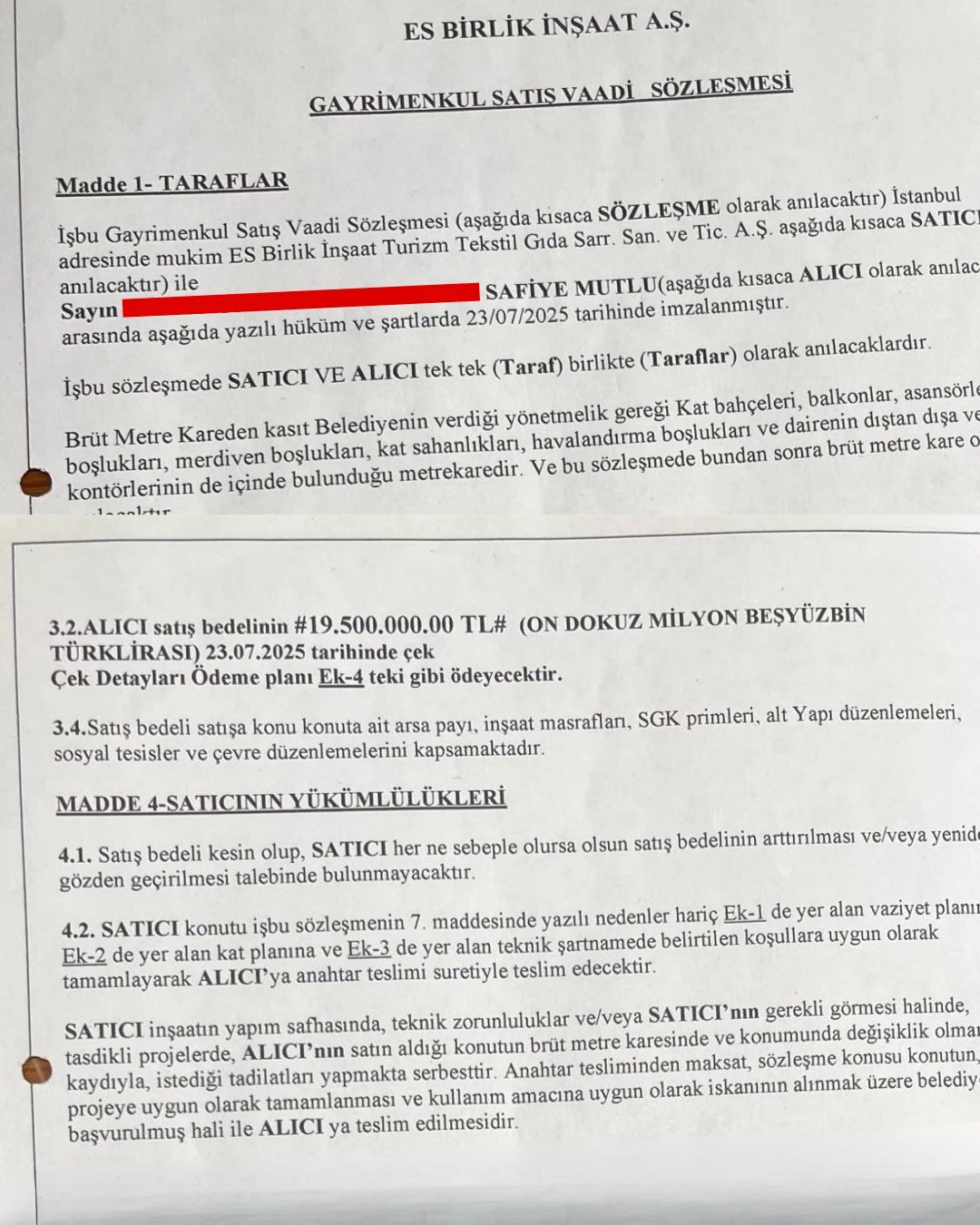 23 Temmuz’da "Gayrimenkul Satış Vaadi Sözleşmesi"ne göre; Emin Sönmez'in şirketi Es Birlik İnşaat, Başkan Hasan Mutlu'nun eşi Safiye Mutlu'ya Bayrampaşa'daki projesinden 19.500.000 TL bedelle iki adet lüks daire sattı.