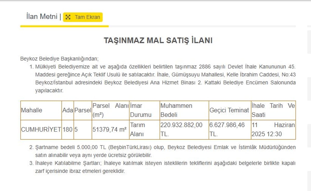 - Beykoz Belediyesi, Cumhuriyet Mahallesi’ndeki 51 dönümlük tarım arazisini 220 milyon 932 bin TL bedelle satışa çıkarıyor.