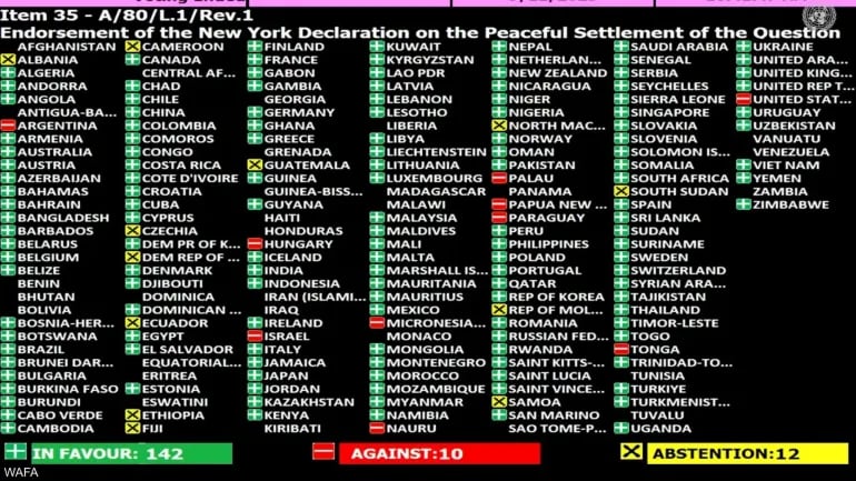 Resmi olarak "Filistin Sorununun Barışçıl Çözümü ve İki Devletli Çözümün Uygulanması İçin New York Deklarasyonu" olarak adlandırılan karar, yapılan oylamada 142 lehte, 10 aleyhte oyla ve 12 çekimser oyla kabul edildi.