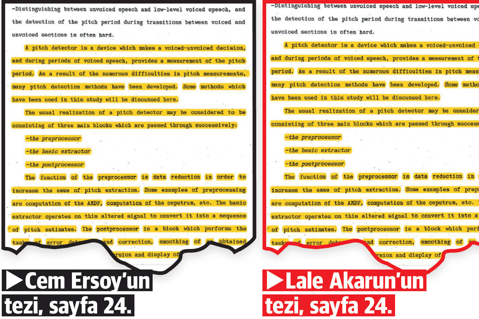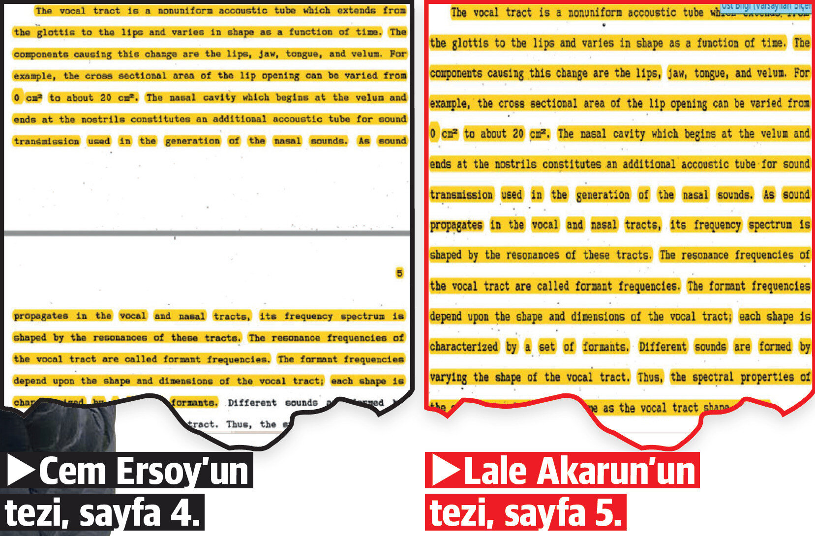 2 yıllık eğitim sürecinde birbirine yardımcı olan Ersoy ile Akarun, tez aşamasına geçince işi daha ileriye taşıdı. İki isim tezlerinin 14 sayfasını blok alarak birebir kopyaladı. Her iki tezde de noktasına virgülüne bile dokunulmadan aynı grafiklere yer verildi. Ayrıca tezlerde blok olarak yapılan alıntılar atıfta bulunmadan kullanıldı. Hiç atıf olmayan kaynaklara da tezde yer verildi. Cem Ersoy, adeta “Tezi birlikte hazırladık” der gibi tezin ithaf kısmında şu ifadelere yer verdi: “Bu tezi bitirmede bana enerji veren lezzetli kekleri ve yemekleri yaptığı için Lale'ye çok müteşekkirim...”