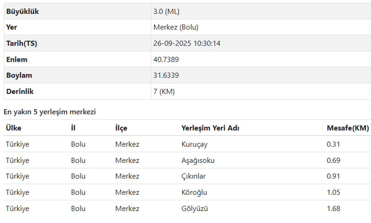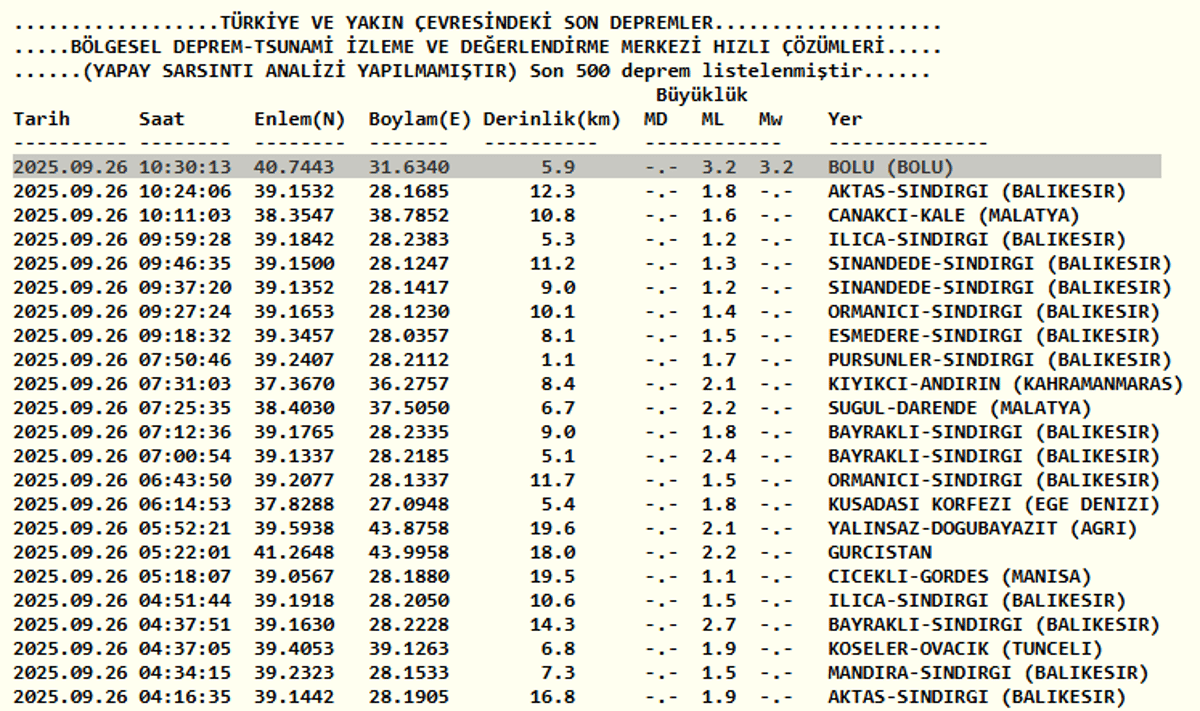 Bolu'da deprem mi oldu? | 26 Eylül AFAD ve Kandilli Rasathanesi son depremler listesi