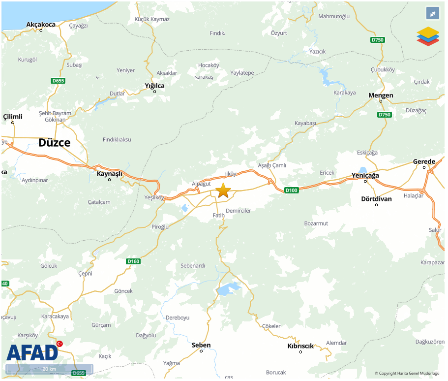 AFAD tarafından yayınlanan haritaya göre Bolu depreminin merkez üssü yıldızla işaretlenen konumdadır.